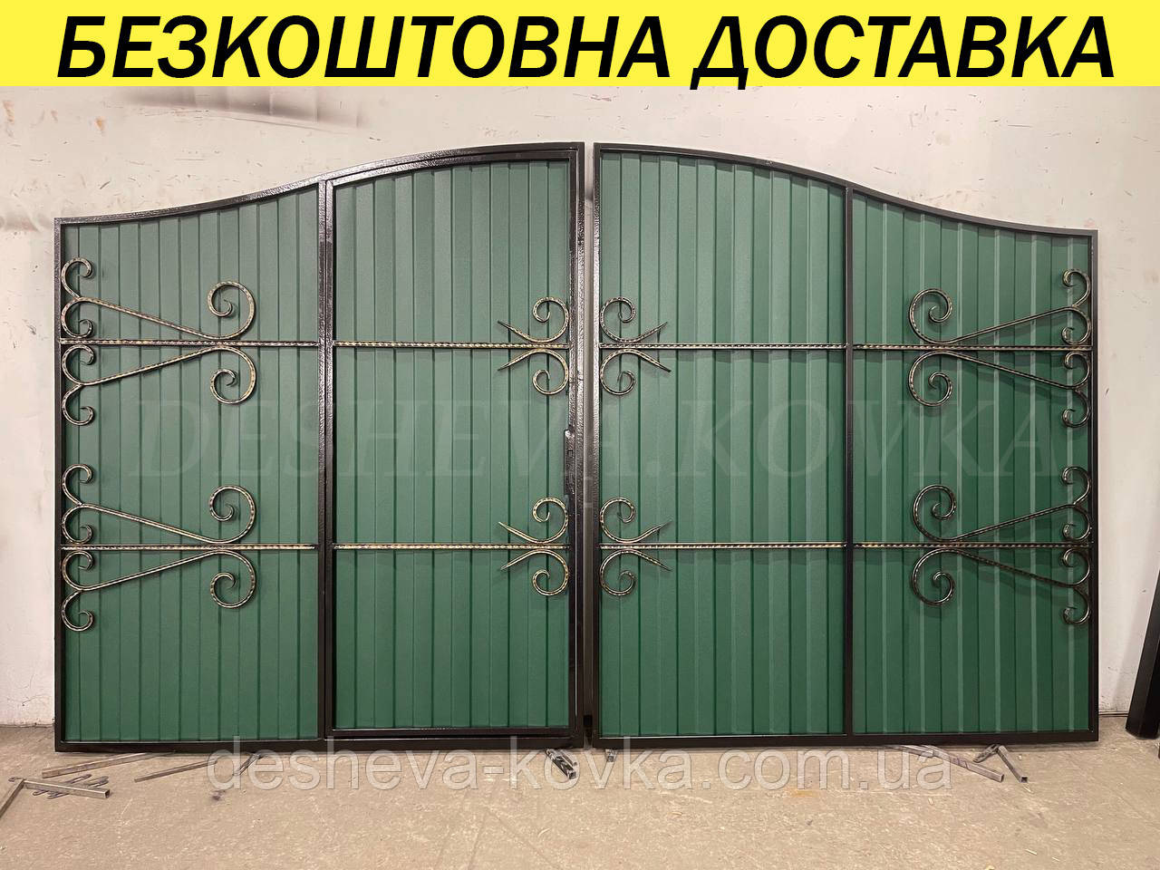 Ворота с ковкой и калиткой внутри Код: А-01001 Мы изготовим ворота индивидуально по вашим размерам за 4 рабочих дня. Наши ворота производятся на современном оборудовании специалистами нашей компании, что гарантирует скорость и качество. Уличные ворота из профнастила отлично подходят для обустройства въезда во двор частного дома. Классические конструкции не зря пользуются спросом на протяжении нескольких веков: они хорошо выполняют свои функции, оставаясь простыми и удобными в использовании. Изделие может иметь любую форму и дизайн: из-за его технических особенностей ограничений в возможностях декорирования практически нет. БЕСПЛАТНАЯ доставка по всей Украине! (Доставка курьером до Вашего дома, в любой город/село Украины.) По желанию заказчика калитка может быть справой или с левой стороны. Стандартные размеры: Ворота: 3.4м х 1.7м по столбикам. Калитка: 0.9м х 1.7м по столбикам. Также мы можем изготовить ворота индивидуально по размерам заказчика. Цвет профнастила по выбору! Наша компания является одним из самых больших производств на рынке Украины. Звоните и мы Вас проконсультируем +380965364101.