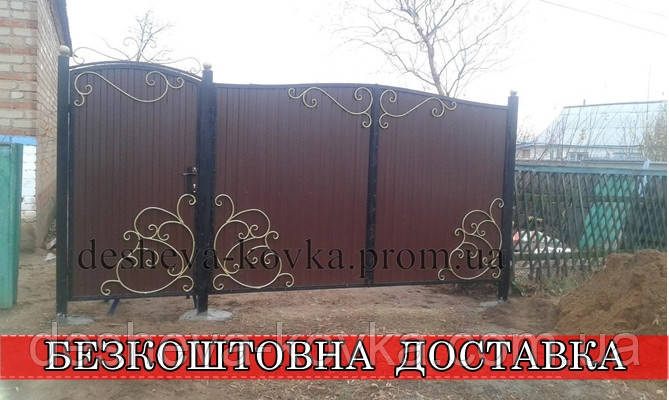 Распашные кованые ворота из калиткой и профнастилом Код: А-0125 Мы изготовим ворота индивидуально по вашим размерам за 4 рабочих дня. Наши ворота производятся на современном оборудовании специалистами нашей компании, что гарантирует скорость и качество. Уличные ворота из профнастила отлично подходят для обустройства въезда во двор частного дома. Классические конструкции не зря пользуются спросом на протяжении нескольких веков: они хорошо выполняют свои функции, оставаясь простыми и удобными в использовании. Изделие может иметь любую форму и дизайн: из-за его технических особенностей ограничений в возможностях декорирования практически нет. БЕСПЛАТНАЯ доставка по всей Украине! (Доставка курьером до Вашего дома, в любой город/село Украины.) По желанию заказчика калитка может быть справой или с левой стороны. Стандартные размеры: Ворота: 3.4м х 1.7м по столбикам. Калитка: 0.9м х 1.7м по столбикам. Также мы можем изготовить ворота индивидуально по размерам заказчика. Цвет профнастила по выбору! Наша компания является одним из самых больших производств на рынке Украины. Звоните и мы Вас проконсультируем +380965364101.