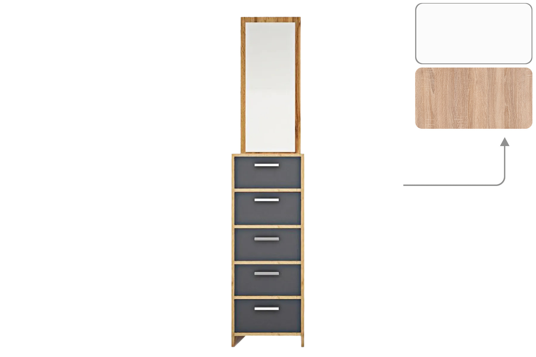 Тумба з дзеркалом NordicNest-4, котра не лише прикрашає ваш передпокій, але й містить 5 шухляд для різноманітних предметів, від косметики до засобів для догляду за взуттям, аксесуарів та прикрас.