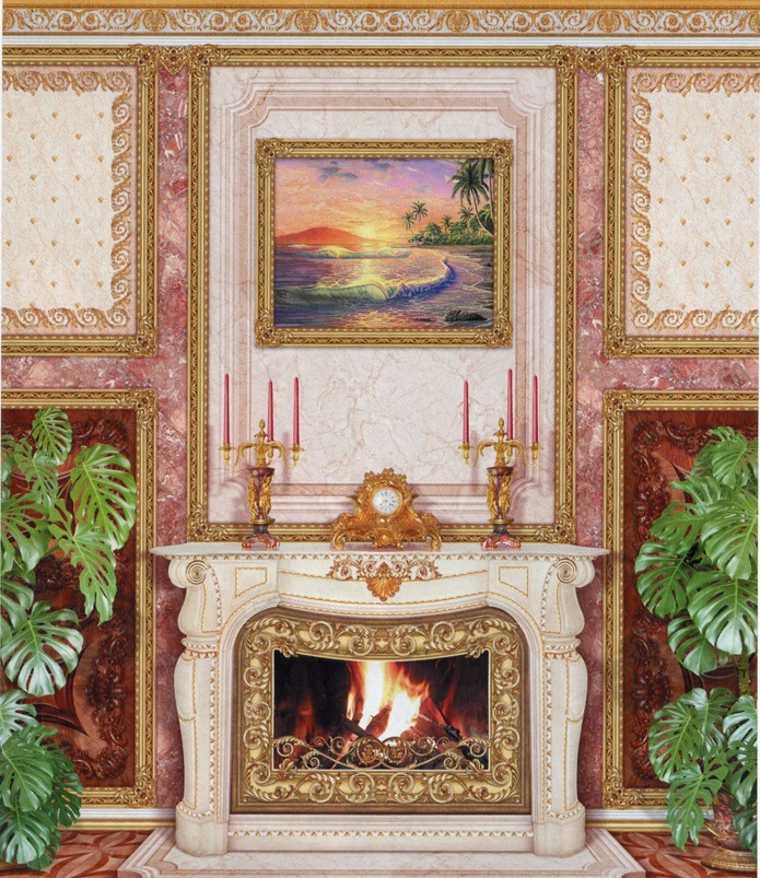 Палаючи дрова, тонке полум'я, келих червоного вина та романтична обстановка, мабуть, про таке мріє будь-яка закохана пара. Фотошпалери Арт Декор Камін «Престиж» допоможуть красиво та барвисто провести час у домашній, затишній обстановці. Фотошпалери в інтер'єрі із старовинним, шляхетним каміном завершать загадковий образ приміщення. На каміні знаходяться свічники та годинники минулого століття, з навколишніми навколо зеленими рослинами та колонами. Фотошпалери 3Д дозволяють правильно розставити життєві пріоритети, акценти.