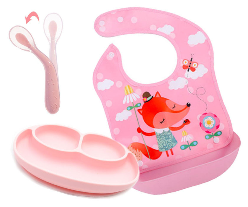 Опис Набір силіконова тарілка килимок, слинявчик ПВХ з лисою та силіконова ергономічна ложка (vol-1095)
