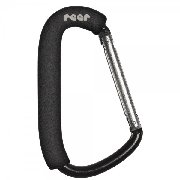 Утримувач для сумок на візок у вигляді карабіну від бренду Reer. З цим власником можна сміливо вішати будь-які важкі сумки чи пакети на коляску. Тримач виконаний з легкого, але при цьому надміцного алюмінієвого сплаву.