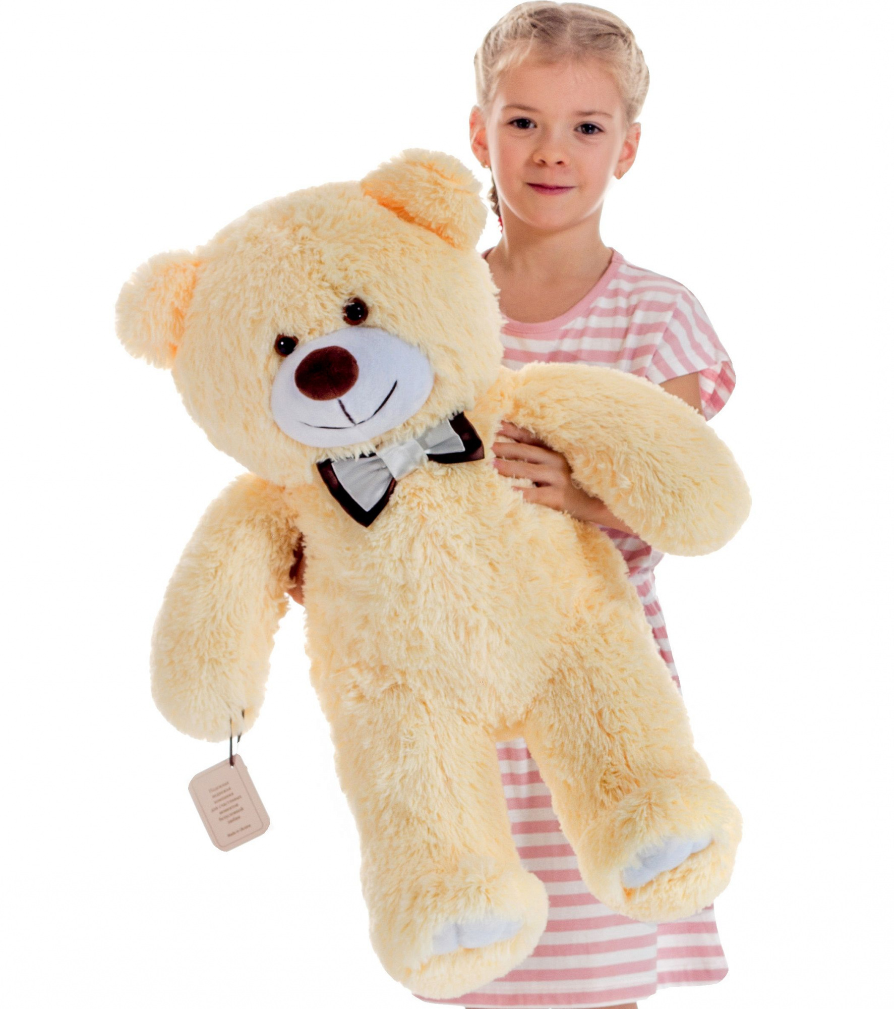 Наші плюшеві ведмедики мають правильні пропорції тіла та не збільшені за рахунок штучно подовжених ніг або інших частин тіла. Ми не відходимо від європейських стандартів вимірювання великих іграшок, тому до розрахунку зростання включено коефіцієнт обсягу. Довжиною ведмедика вважається сума двох відрізків у положенні сидячи: від голови до хвоста (це перший) та від хвоста до закінчення лап (це другий).