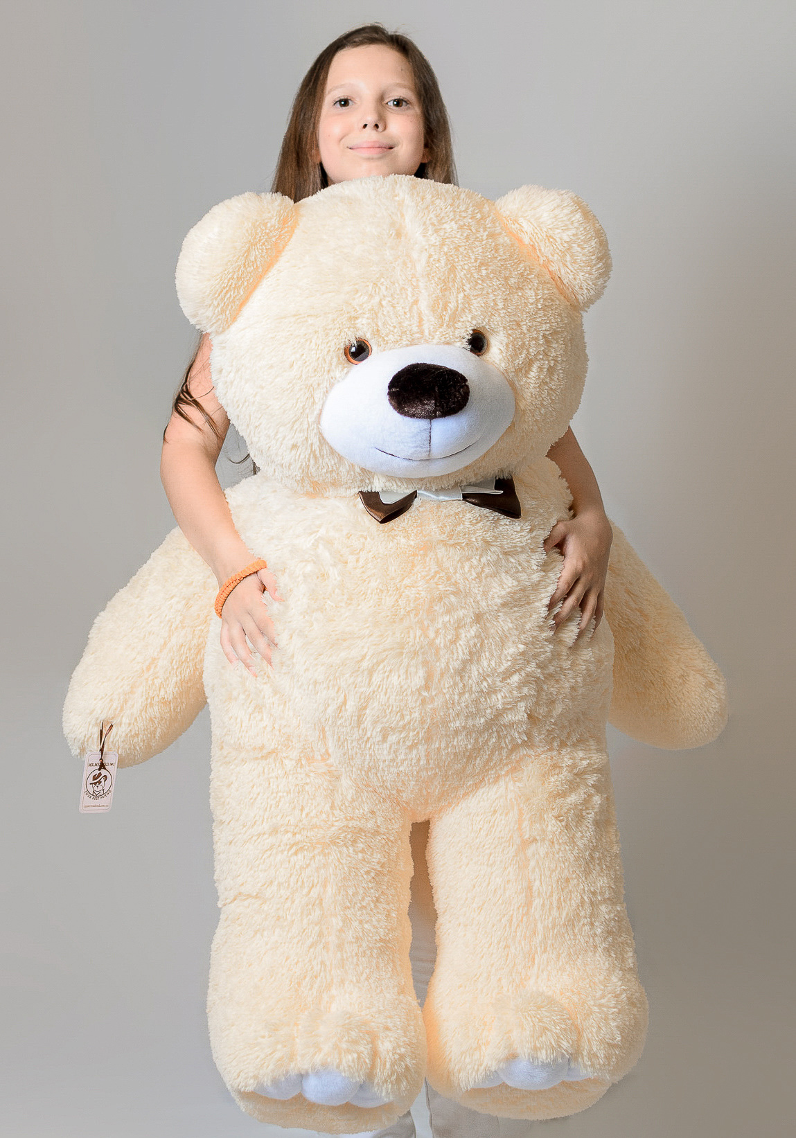 Наші плюшеві ведмедики мають правильні пропорції тіла та не збільшені за рахунок штучно подовжених ніг або інших частин тіла. Ми не відходимо від європейських стандартів вимірювання великих іграшок, тому до розрахунку зростання включено коефіцієнт обсягу. Довжиною ведмедика вважається сума двох відрізків у положенні сидячи: від голови до хвоста (це перший) та від хвоста до закінчення лап (це другий).