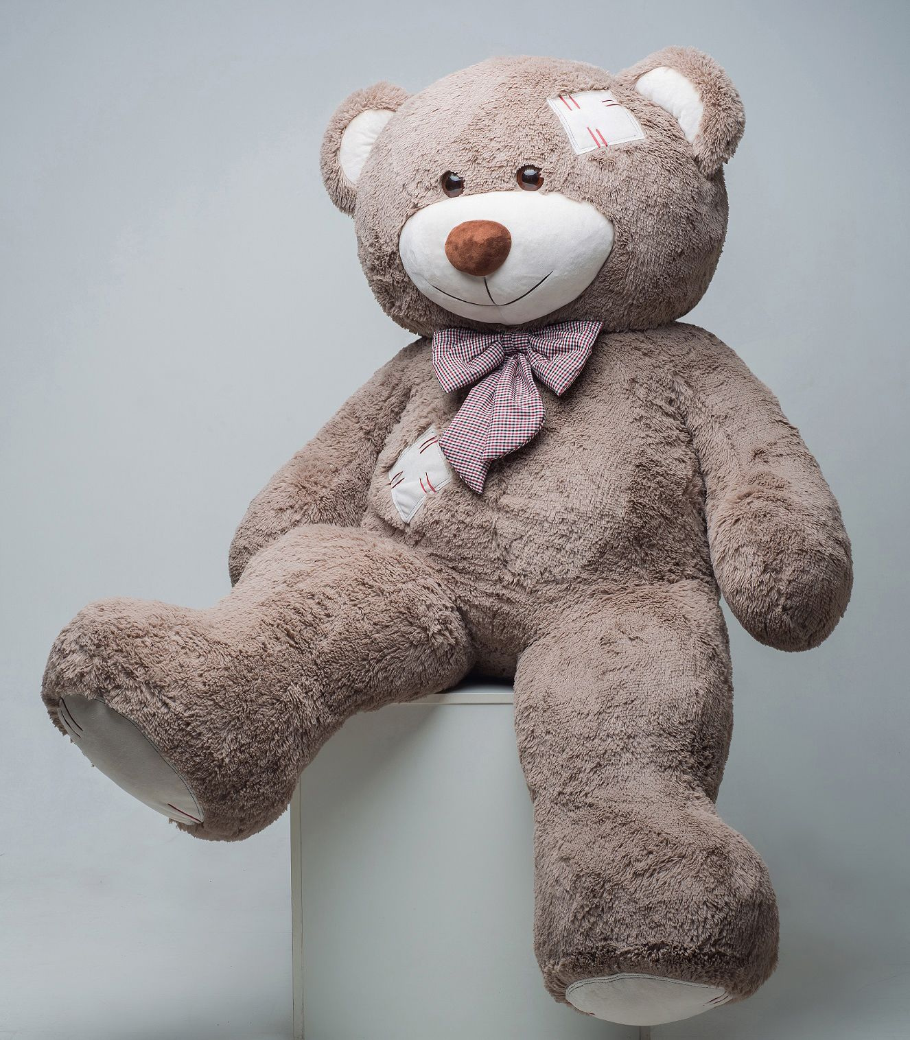 Наші плюшеві ведмедики мають правильні пропорції тіла і не збільшені за рахунок штучно подовжених ніг чи інших частин тіла. Ми не відходимо від європейських стандартів вимірювання великих іграшок, тому до розрахунку зростання включено коефіцієнт обсягу. Довжиною ведмедика вважається сума двох відрізків у положенні сидячи: від голови до хвоста (це перший) та від хвоста до закінчення лап (це другий).