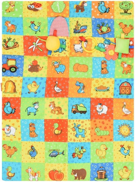 Мякий, розвиваючий килимок створений спеціально для маленьких діток. Брязкальце, пищалка, прорізувач і пелюстка обовязково приведуть в захват малюка. Для зручності використання на килимку зафіксовано рознімне кільце, на яке можна підвісити улюблену іграшку. Завдяки спеціальному наповненню килимок зберігає тепло і не пропускає вологу і холод. Нижня частина чохла виконана з непромокаючої матеріалу, тому килимок можна використовувати не тільки в будинку, але і на прогулянці. Склад: х /б тканину; різнофактурні матеріали; швейна фурнітура; звукові елементи; холлофайбер; ізолон. Розмір: 72 × 53,5 × 1 см. Розмір в упаковці: 33 × 16,5 × 5 см.