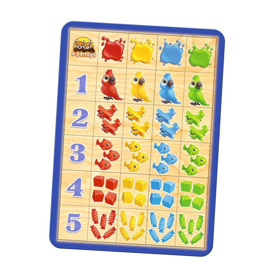 У наборі 29 плашок. Як грати: дитині необхідно розташувати плашку з папужками, літачками, рибками, кубиками та цукерками у потрібній графі, у зазначеному кольорі та з правильною кількістю героїв (плашки з цифрами від 1 до 5 для наочного вивчення рахунку). Усі деталі взаємозамінні - це означає, що щоразу можна змінювати умови гри. Гра розвиває увагу, логіку, мислення та пам'ять. Вчимо рахунок та кольори, весело граючи. 1. Розвиток логічного і понятійного мислення 2. За допомогою такого методичного матеріалу, діти пізнають навколишній світ. 3. Розвивається дрібна моторика. Вставляючи певним чином детальки, чудово тренуються пальчики. 4. Працює зорова пам'ять, тренується увагу і посидючість.