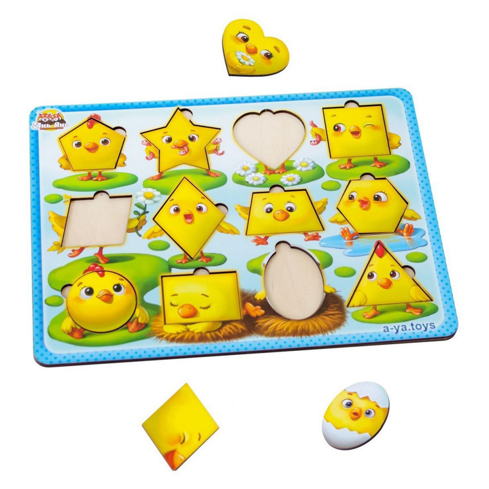 12 вкладишів-курчат, які за формою є різними фігурами. Потрібно поставити кожну на своє місце. Вивчати фігури стане веселіше і наочніше.