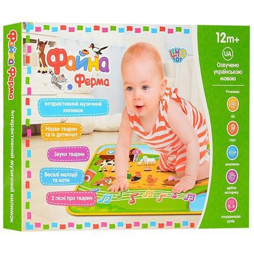 Розвиваючий килимок M3455 Файна ферма зроблений з якісних і безпечних матеріалів. Килимок M3455 одразу ж приверне малюка яскравим оформленням і красивими зображеннями. Озвучений він українською мовою. Працює в трьох режимах. Завдяки йому дитина зможе вивчити назви тварин і їх дитинчат, дізнатися, які звуки вони видають. Крім того, можна, буде послухати різні веселі мелодії і пісеньки, а також ноти. Килимок може автоматично вимикатися через деякий час після того, як з ним перестали грати. Працює він від батарейок (буде потрібно три штуки типу АА). В процесі гри дитинка не тільки дізнається нову інформацію, у нього також буде розвиватися дрібна моторика, тактильне, слухове, зорове сприйняття і т.д. Вік: 6m+ Розмір: 72х50 сантиметрів Розміриупаковки: 50х37х4,5 сантиметрів