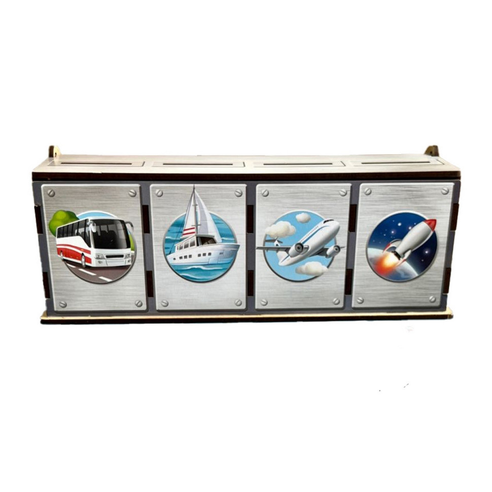 4 тематичні скриньки з різними видами транспорту: водний, сухопутний, повітряний та космічний. У наборі йде 40 плашок із реалістичними малюнками для сортування та 4 картки для гри в лото. Дитині потрібно розкласти весь транспорт асоціаціями: автобус - це наземний вид транспорту, а корабель - водний і т. д. Другий варіант гри: викладайте по 3 плашки з тематикою, наприклад, повітряного транспорту, а 4 з поїздом і просіть дитину знайти зайву плашку в цьому ланцюжку. Розгляньте всі фішки разом із дитиною. Назвіть транспорт, який зображений на фішках. Запропонуйте дитині сховати всі фішки в будиночки, опускаючи в отвори коробки-сортера. Гра "Лото для малюків". Візьміть одну картку та підберіть заздалегідь для неї фішки. Розгляньте та назвіть разом із дитиною всі зображення на фішках та на картках. Ви можете урізноманітнити гру, сховавши фішки в мішечок. Попросіть дитину витягувати з мішечка по одній фішці і знаходити таку ж картинку (будиночок фішки) на картці. Ще один варіант гри для малюків: викладаєте по 3 плашки з тематикою, наприклад, водний транспорт, а 4 з літаком і просіть дитину знайти зайву плашку в цьому ланцюжку. Гра "Лото". Розгляньте та назвіть зображення на картках. Фішки розкладіть на столі зображення вниз. Картки розподіліть між гравцями (можна вибрати). Вибирається ведучий, який відкриватиме по одній фішці і називатиме зображену на ній картину. Гра "Дві руки". Викладіть перед дитиною фішки із зображеннями, які стосуються лише двох видів транспорту. Попросіть дитину збирати та кидати фішки в коробку-сортер двома руками (правою рукою можна збирати тільки водний, а лівою – тільки наземний). Старшим дітям можна запропонувати варіант гри на час. Вікторина. Поповнюйте знання дитини цікавими фактами про різні види транспорту. Запропонуйте йому зіграти у вікторину, в якій ви ставитимете запитання, а дитина - давати на них відповіді.