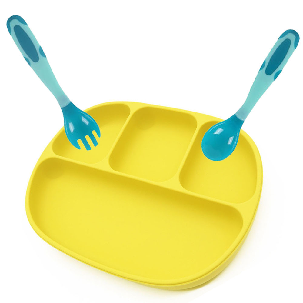 Дитяча чотири-секційна силіконова тарілка створена з урахуванням усіх вимог мам для годування дітей від 1-го місяця до 5 років: Посуд із силікону, тарілка, має ряд переваг та переваг перед іншими видами дитячого посуду: 1.Тарілка на чотири секції з харчового силікону 2. Представлена тарілка має потрібні вигини для зручності при експлуатації. або в НВЧ 6.Силіконова тарілка: секційна має присоску, що забезпечує стійкість посуду на столику для годування або на будь-якій іншій гладкій і чистій поверхні. 7.Вона зберігає свій первісний вигляд протягом усього терміну експлуатації. Секційна силіконова тарілка із чотирьох секцій на присосці. У ній можна готувати їжу для дитини, поєднувати різні види продуктів за консистенцією та температурою. Тарілка має присоску на дні і не ковзає по поверхні столика, - це особливо зручно коли малюк захоче вчитися їсти самостійно, але також є виступ, що легко відчепити липучку. Термочутлива ложка/вилка, що змінює форму Ложку можна вигнути і вона залишиться в тій формі, яку ви їй додасте, це дасть можливість швидше дитині звикнути до нових самостійних рухів. Довжина ручки 14,4 см забезпечує комфортне годування батьками без проливання, також підходить для всіх видів баночок і контейнерів. Характеристики: Матеріал: Силікон + харчовий пластик. Легко доглядати: можна мити руками або в посудомийній машині. Довжина - 14,4 см товщина ручки (в найширшому місці 3 см) Якщо ложку вигнути, то вона залишиться в вигнутій формі (формі яка Вам потрібна). Конструкція, чутлива до температури, щоб уникнути опіків. Коли температура їжі перевищує 40 ℃, головка ложки стає білою, а коли температура нижче 40 ℃, колір відновлюється. Наша рекомендація: перед використанням промити теплою водою з додаванням нейтрального миючого засобу. Про різницю у кольорі: Всі товари зроблені на натуральних фотографіях. Через різні монітори та освітлення під час зйомки, факторів навколишнього середовища тощо, є невелика різниця в кольорі, яка об'єктивна і її не можна уникнути! Хроматична аберація не є проблемою якості.