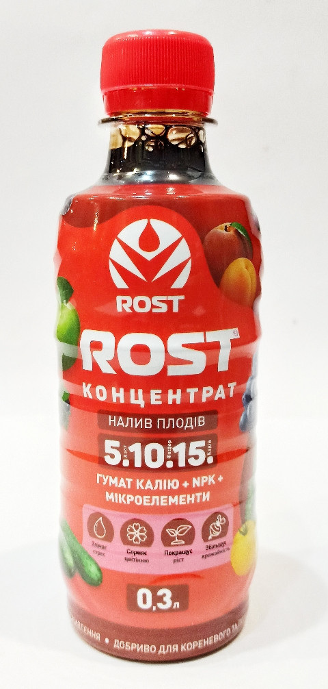 Rost концентрат – натуральне органо-мінеральне добриво на основі гумату калію містить комплекс макро- та мікроелементів у високій концентрації. Добриво забезпечує рослину всіма необхідними елементами живлення; мобілізує імунну систему рослин, підвищує