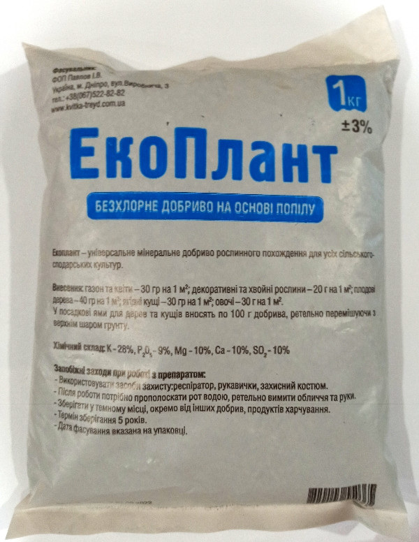 ЕкоПлант – одне з небагатьох калійних добрив для рослин, яке можна застосовувати на овочевих та ягідних культурах без ризику одержати пригнічення хлором. Добриво можна застосовувати для осіннього підживлення газонів, дерев, винограду, ягідників, кущів троянд та інших багаторічних квітів, для основного внесення під озимі культури, а також навесні під кукурудзу, сою, соняшник, овочеві культури (картопля, буряк, капуста, морква).
