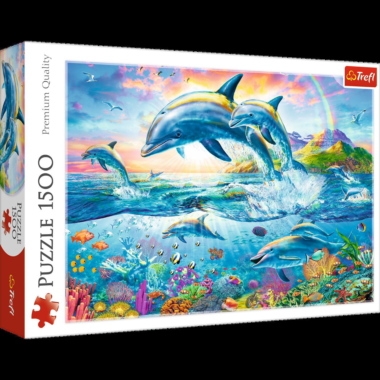 Пазли 1500 елементів із сімейством дельфінів, що стрибають над водою, на тлі чудового виду. Після складання буде створено малюнок розміром 85х58 см. Виріб був виготовлений з високоякісних матеріалів, використовуючи спеціальний каландровий світловідбиваючий папір, який полегшує складання. Продукт вироблявся в Польщі, а для виробництва використовувались екологічні матеріали.