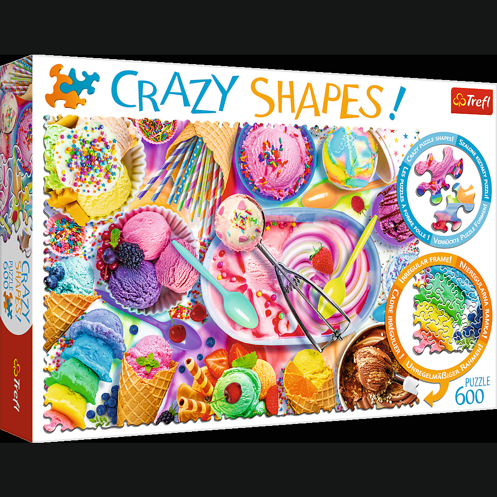 Божевільні форми! Це найбільш божевільна серія пазлів в світі, в якій пазли мають божевільну нестандартну форму, відсутні прямі лінії, лінії кінцевого зображення скручені і нерівні. Пазл складається з 600 елементів, після того, як його складуть буде створена картинка розміром 680 x 480 мм, зі смачнющим морозивом. Виріб виготовлено з якісних матеріалів із застосуванням спеціального каландрового світловідбиваючого паперу, який полегшує складання.