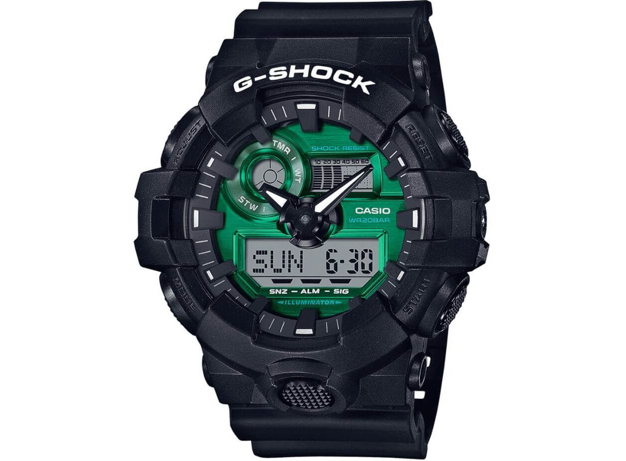 Чоловічий годинник Casio G-shock GA-700MG-1AER зберегли яскравий чорний колір, а їх відмітним елементом є зелений циферблат. Підсвічування можлива завдяки опції Super-Illuminator, для якої характерно яскраве світіння.