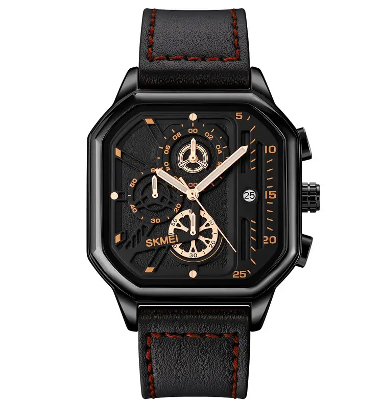 Годинник SKMEI 1963 виконаний у стильному дизайні та вдало доповнить образ сильного та впевненого в собі чоловіка. Ремінець-браслет виготовлений з натуральної шкіри та підходить для тих, хто не може носити браслети з металу. Крім того, на циферблаті відображається поточна дата. Також вбудовано додаткову функцію: секундомір. На стрілки та позначки нанесено люмінесцентне покриття, яке дозволяє визначати час навіть у темряві. Корпус виготовлений герметичним, що підтверджує стандарт 3 АТМ.