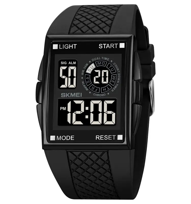 Лаконічний наручний годинник SKMEI 1967 виглядає стильно і не містить жодних зайвих елементів у дизайні: чорний циферблат обрамлений чорним корпусом, що переходить у чорний ремінець з поліуретану. Виділяється лише незвичайна організація елементів на циферблаті: секунди відображаються в окремому вікні, а дата з днем тижня розміщена разом у правому верхньому кутку. Розширений функціонал вносить ще більше можливостей застосування цього аксесуара у повсякденному житті. Крім часу, у них вбудований будильник, секундомір та таймер. Для зручності налаштування та використання з боків корпусу розташовано чотири кнопки різного призначення. Рівень захисту від потрапляння вологи та пилу підтверджено стандартом 3 АТМ, що запобігає пошкодженню механізму при попаданні крапель води на корпус та дозволяє користуватися аксесуаром не побоюючись за його збереження.
