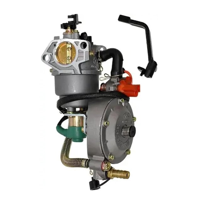 Карбюратор генератора (мотоблока) GX 390; 188F;190F (5.5кВт; 6кВт; 6,5кВт; 7,5кВт; 8кВт) + газовий редуктор. в годину. Заміна карбюраторів на двигунах (188F/190F) займає близько 20 хвилин. Генератори цих карбюраторах можуть працювати на зрідженому газу - пропан і бутан. Також на природному магістральному метані. Для роботи генератора на зрідженому газу можна використовувати будь-який газовий балон з редуктором, який можна підключити до карбюратора. Робота генератора на зрідженому газу буде значно дешевшою ніж на бензині, але і можливе більш інтенсивне зношування компонентів головки блоку. Рекомендується частіша перевірка зазорів клапанів, зазор краще виставляти трохи в плюсі. При плюсовій температурі генератор можна запускати як на бензині так і газу. Після запуску генератора на бензині, необхідно перекрити бензиновий кран на баку, відкрити помаранчевий газовий кран на карбюраторі. Генератор перейде на газ. Після цього необхідно злити залишок палива з камери поплавця карбюратора за допомогою крана. Підключити генератор до магістрального газу можна через трійник і шланг до карбюратора. Подібні роботи потрібно довірити кваліфікованим фахівцям. При підключенні до магістрального газу використовують шланг діаметром 16 мм перехідником на 10 мм. В іншому випадку якщо шланг на всій довжині буде діаметром 10 мм, особливо якщо відстань більше 3-4 м, генератор може задихатися. Газ не встигатиме надходити до карбюратора. на пропані (дешевше бензину на 40%) Працює на природному газі (працює на звичайному магістральному газі) Працює і далі на бензині перемикається важелем.