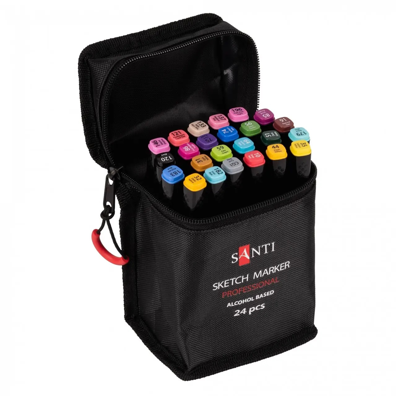 Набір спиртових маркерів SANTI для малювання. Підходять для створення художніх робіт у різних техніках, включаючи скетчінг, каліграфію та ілюстрування. У наборі 24 маркери різного кольору, для зручності назва кольору нанесена на ковпачок. Кожен маркер має два наконечники різної форми: загострений наконечник для тонких ліній та плоский зі скошеним стрижнем для широких штрихів. Чорнило на спиртовій основі добре вбирається в папір. Рекомендується використовувати для малювання спеціальні альбоми, цупкі аркуші паперу або картон. Кольори добре поєднуються між собою. Корпус виготовлений із поліпропілену.