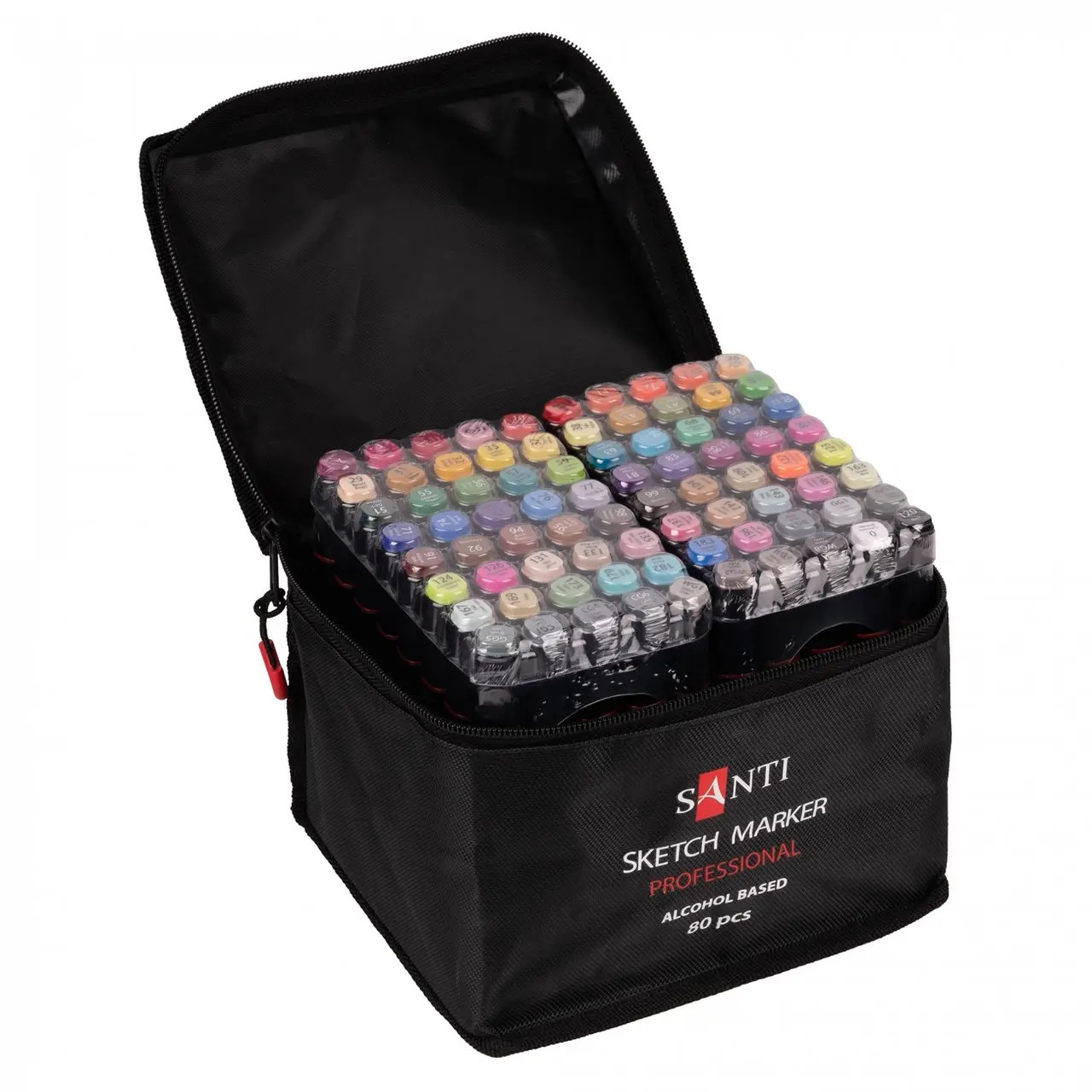 Набір спиртових маркерів SANTI для малювання. Підходять для створення художніх робіт у різних техніках, включаючи скетчінг, каліграфію та ілюстрування. У наборі 79 маркерів різного кольору та 1 безбарвний блендер, для зручності назва кольору нанесена на ковпачок. Кожен маркер має два наконечники різної форми: загострений наконечник для тонких ліній та плоский зі скошеним стрижнем для широких штрихів. Чорнило на спиртовій основі добре вбирається в папір. Рекомендується використовувати для малювання спеціальні альбоми, цупкі аркуші паперу або картон. Кольори добре поєднуються між собою. Корпус виготовлений із поліпропілену.