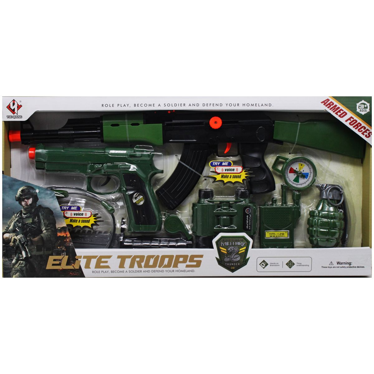 Великий набір зі зброєю та аксесуарами для захоплюючих сюжетно-рольових ігор обов'язково вразять дитину. У комплекті є великий автомат-тріскачка (50 см), пістолет, ніж, свисток, бінокль, навушники з мікрофоном, рація, компас та граната. Усі елементи набору виконані із міцного пластику.
