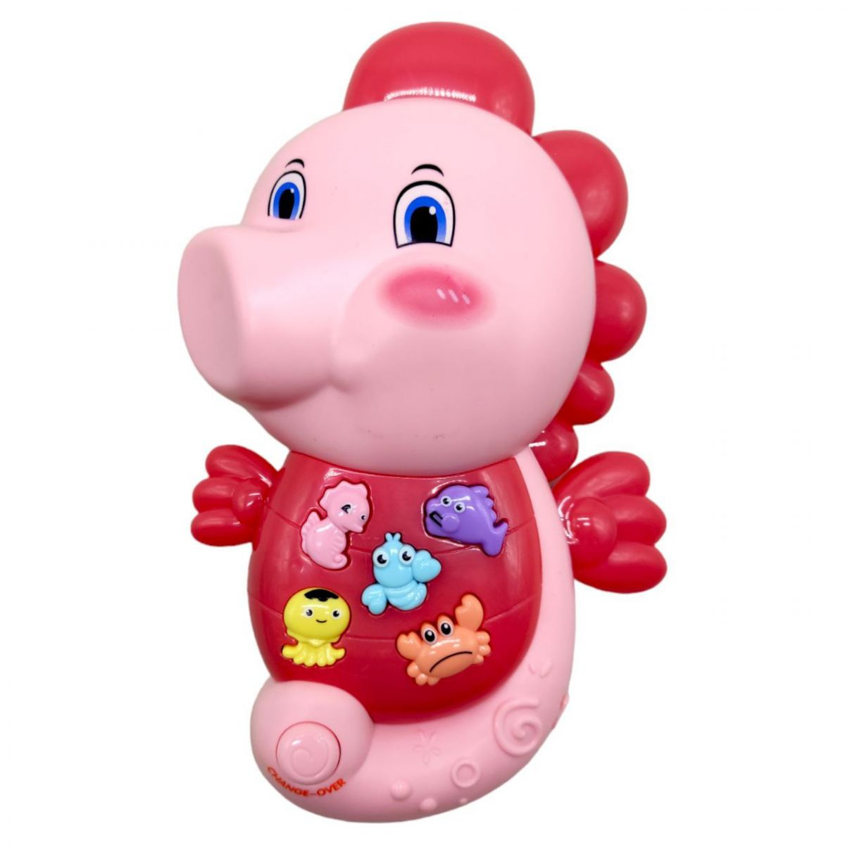 Цікава інтерактивна іграшка у вигляді морського коника. На пузику коника розміщено 5 кнопок у вигляді морських мешканців. Натиснувши на кожну з кнопок, можна почути забавний звук або мелодію (залежно від вибраного режиму). Кнопка-перемикач режимів знаходиться на хвості ковзана. Також у цієї іграшки можна регулювати гучність. Розмір - 17х10х4, 5 см. Працює від 3-х батарейок ААА (у комплект не входять).