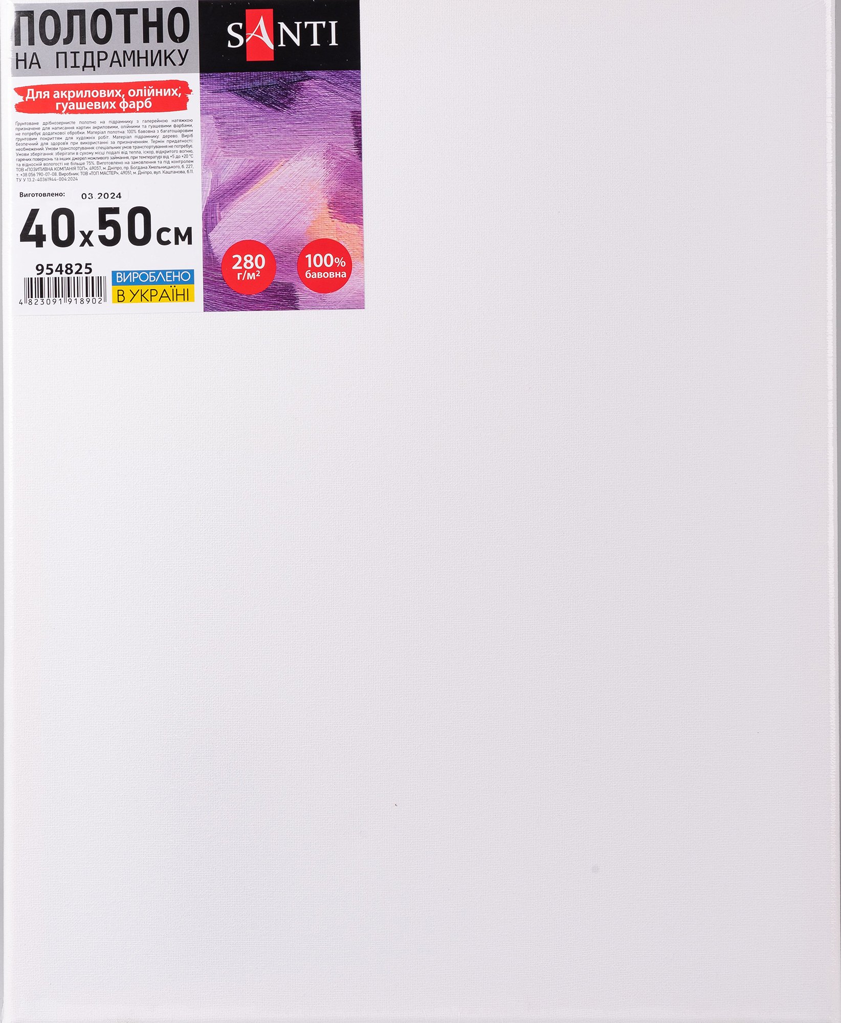 Полотно на підрамнику ТМ SANTI – це незамінна річ в художній діяльності, яка є основою для майбутніх шедеврів. Полотно на підрамнику ТМ SANTI можуть використовувати як художники-професіонали, так і початківці. Полотно на підрамнику ТМ SANTI повністю підготовлено до роботи, має галерейну натяжку та багатошарове ґрунтове покриття. Полотно на підрамнику ТМ SANTI призначене для написання картин акриловими, олійними та гуашевими фарбами. Дрібнозернисте полотно добре утримує фарбу, не вбираючи її, та зберігає природний тон та блиск фарби. Багатошарова ґрунтовка забезпечує ідеальну поверхню для нанесення фарби в різних техніках. Картини написані на полотні на підрамнику зручно зберігати, легко переносити та підвішувати. Технічні характеристики полотна на підрамнику ТМ SANTI: - розмір полотна на підрамнику: 40 х 50 см; - щільність полотна: дрібнозернисте, 280 г/м2; - матеріал полотна: 100% бавовна з багатошаровим ґрунтовим покриттям для художніх робіт; - матеріал підрамнику: дерево; - галерейна натяжка; - колір: білий. Придбавши продукцію для творчості ТМ SANTI ви зможете з легкістю втілити свої творчі ідеї в реальність.