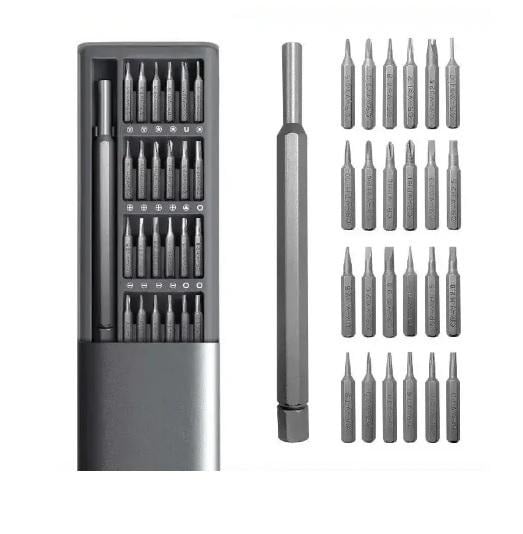 У комплект входить все необхідне для ремонту дрібної електроніки: 24 різні викрутки та намагнічений тримач, який чудово утримує біти. Футляр намагнічений та утримуючий біти у своїх відсіках. Кінець викрутки оснащений поворотним ковпачком, вам потрібно повільно повернути ковпачок рукою, щоб легко затягнути гвинт однією рукою.