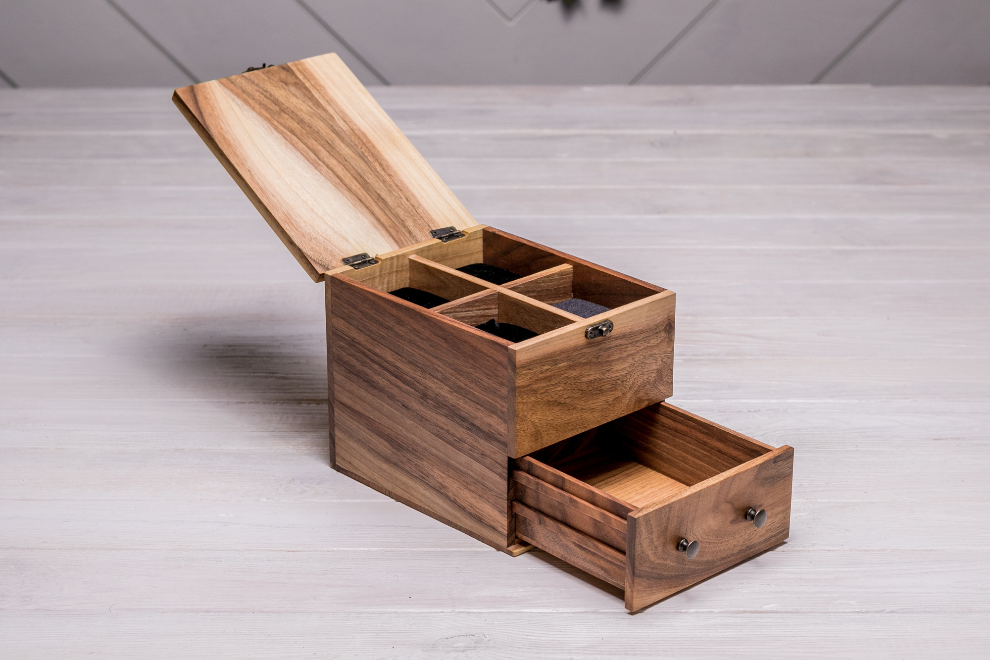 Дерев'яний органайзер для годинника з ящиком - незамінний аксесуар. Не так просто знайти затишне місце для всіх щоденних речей - наручного годинника, запонок, ремінців, браслетів, метеликів та окулярів. Спеціально для цього ми розробили дерев'яні органайзери для зберігання всіх Ваших аксесуарів у одному місці. Розмір нижньої шухлядки в залежності від кількості годинників відрізняється по ширині, але однаковий по глибині і висоті, розмір комірки стандартний - 60х80х65 мм, чого більш ніж достатньо навіть для громіздких годинників.