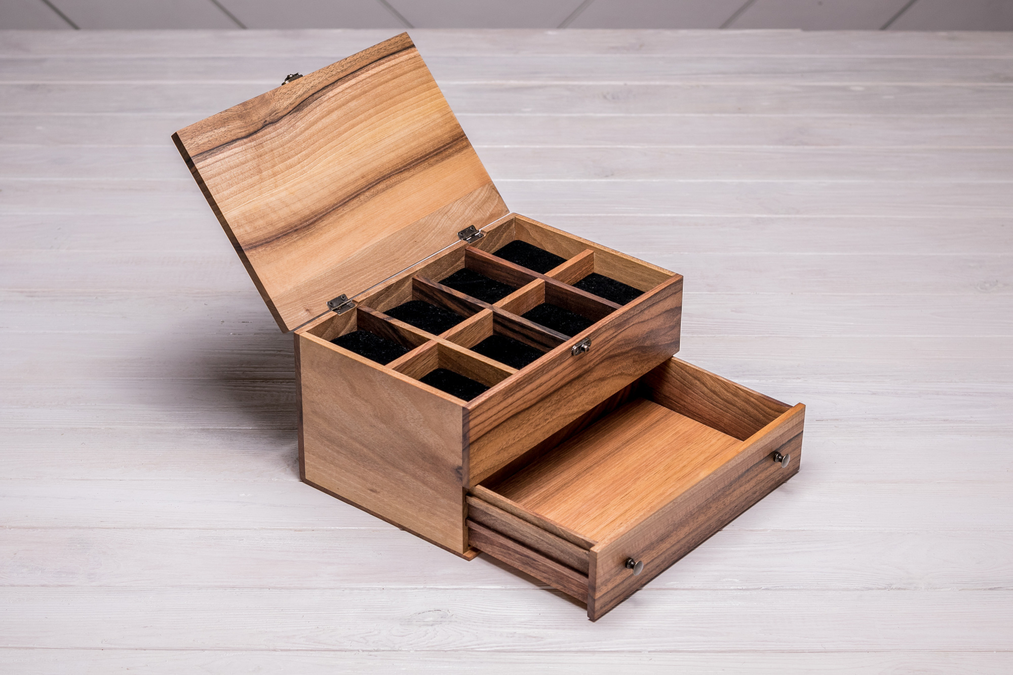 Дерев'яний органайзер для годинника з ящиком - незамінний аксесуар. Не так просто знайти затишне місце для всіх щоденних речей - наручного годинника, запонок, ремінців, браслетів, метеликів та окулярів. Спеціально для цього ми розробили дерев'яні органайзери для зберігання всіх Ваших аксесуарів у одному місці. Розмір нижньої шухлядки в залежності від кількості годинників відрізняється по ширині, але однаковий по глибині і висоті, розмір комірки стандартний - 60х80х65 мм, чого більш ніж достатньо навіть для громіздких годинників.