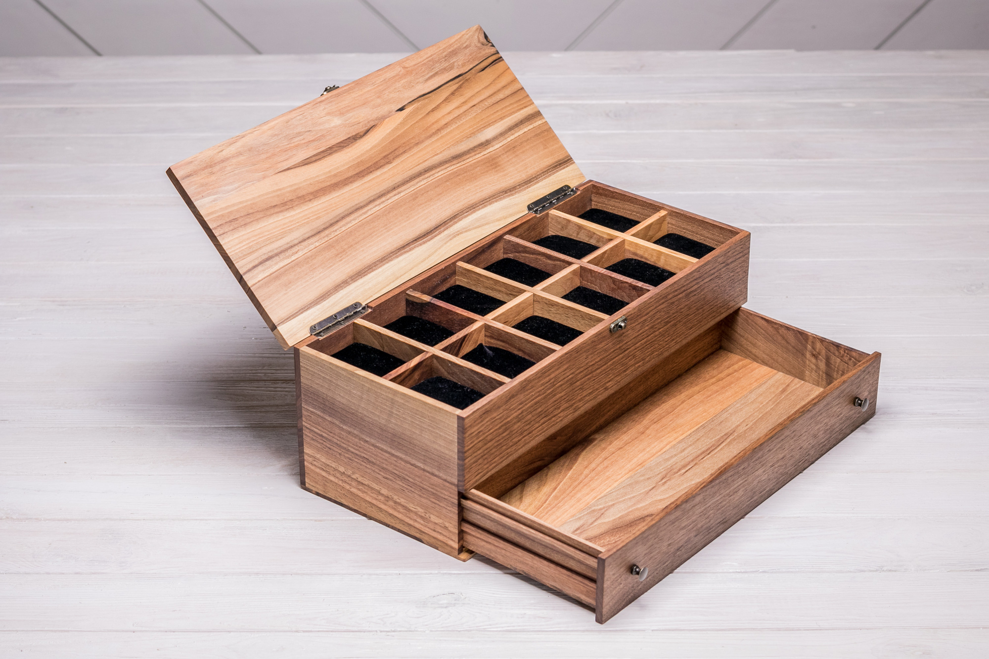 Дерев'яний органайзер для годинника з ящиком - незамінний аксесуар. Не так просто знайти затишне місце для всіх щоденних речей - наручного годинника, запонок, ремінців, браслетів, метеликів та окулярів. Спеціально для цього ми розробили дерев'яні органайзери для зберігання всіх Ваших аксесуарів у одному місці. Розмір нижньої шухлядки в залежності від кількості годинників відрізняється по ширині, але однаковий по глибині і висоті, розмір комірки стандартний - 60х80х65 мм, чого більш ніж достатньо навіть для громіздких годинників.