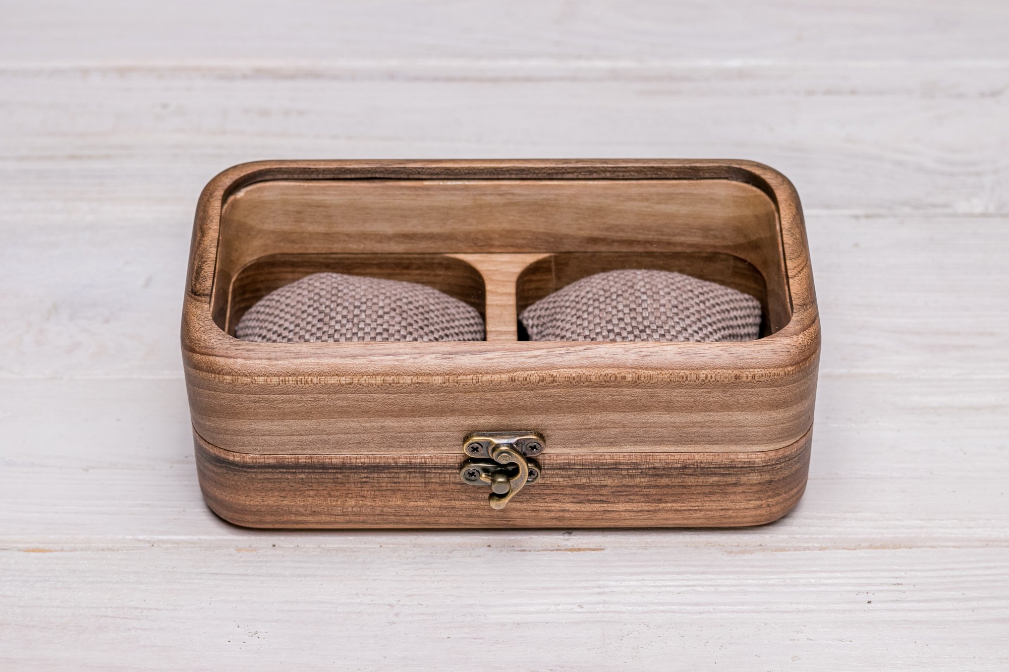 У відкритому положенні кришка повністю кладеться на рівну поверхню. Подушечки зроблені з якісних дорогих матеріалів: дуже приємні на дотик, зручні у використанні та не деформуються при тривалій експлуатації. При виготовленні виробу використано якісну металеву фурнітуру преміального класу, яка має елегантний зовнішній вигляд та тривалий термін користування, а багата деревина волоського горіха надає дерев'яній коробочці для Ваших годинників ексклюзивність та преміальність! Скло для скриньок вирізане на гідроабразивному верстаті та закрите штапиком із тильного боку, що робить зовнішній вигляд скриньки зручним у використанні та елегантним зовні!