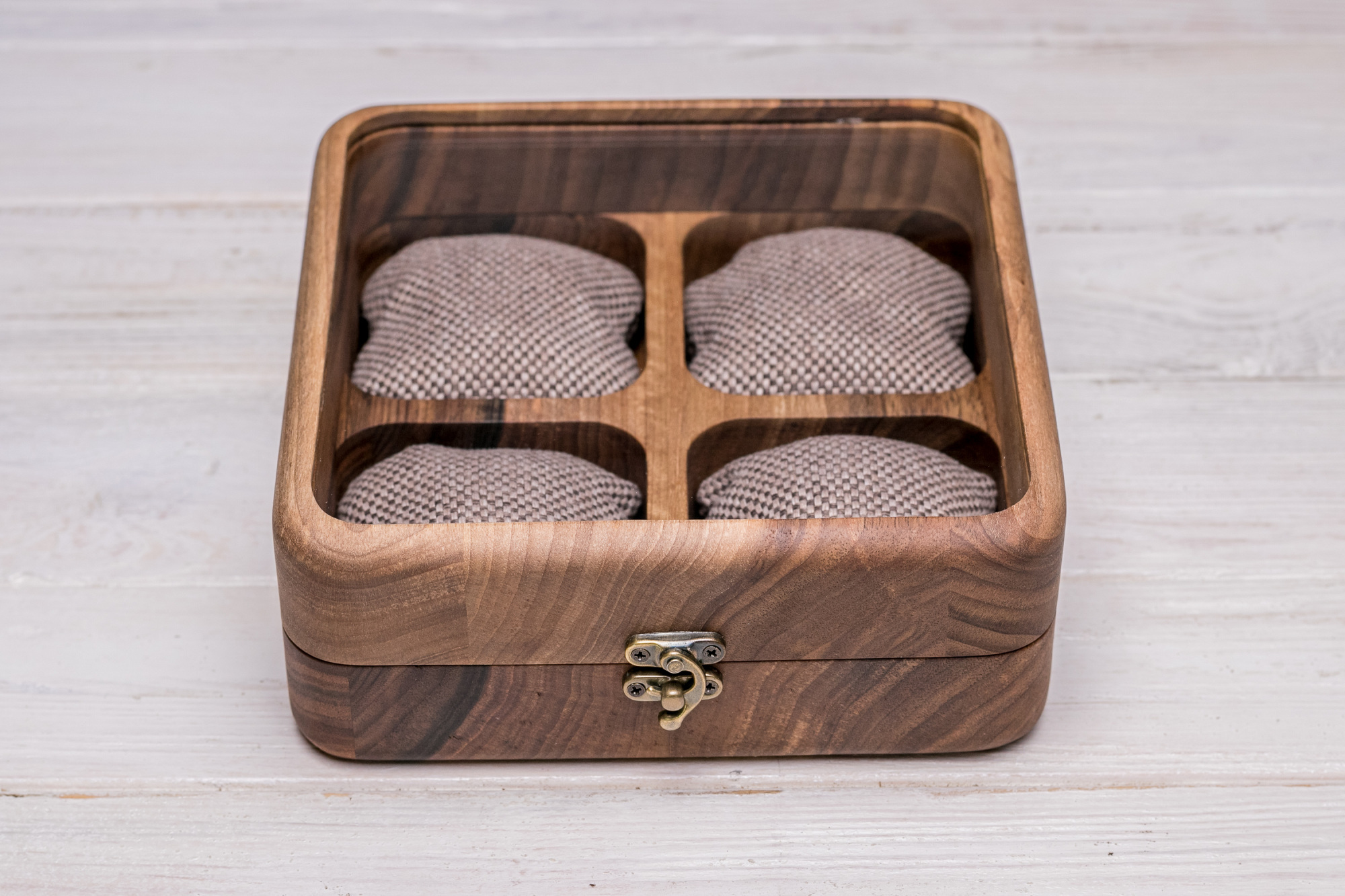 У відкритому положенні кришка повністю кладеться на рівну поверхню. Подушечки зроблені з якісних дорогих матеріалів: дуже приємні на дотик, зручні у використанні та не деформуються при тривалій експлуатації. При виготовленні виробу використано якісну металеву фурнітуру преміального класу, яка має елегантний зовнішній вигляд та тривалий термін користування, а багата деревина волоського горіха надає дерев'яній коробочці для Ваших годинників ексклюзивність та преміальність! Скло для скриньок вирізане на гідроабразивному верстаті та закрите штапиком із тильного боку, що робить зовнішній вигляд скриньки зручним у використанні та елегантним зовні!