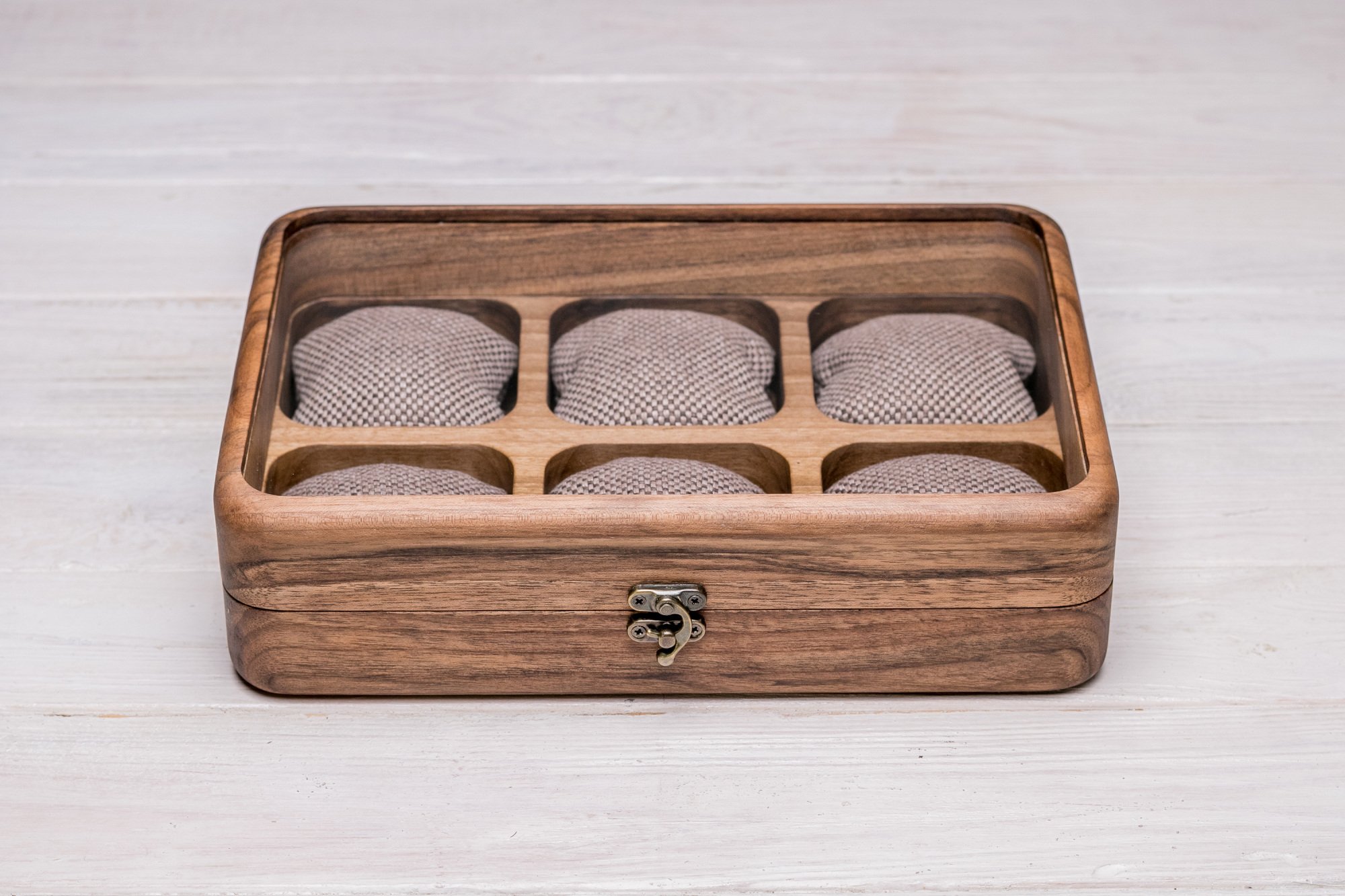 У відкритому положенні кришка повністю кладеться на рівну поверхню. Подушечки зроблені з якісних дорогих матеріалів: дуже приємні на дотик, зручні у використанні та не деформуються при тривалій експлуатації. При виготовленні виробу використано якісну металеву фурнітуру преміального класу, яка має елегантний зовнішній вигляд та тривалий термін користування, а багата деревина волоського горіха надає дерев'яній коробочці для Ваших годинників ексклюзивність та преміальність! Скло для скриньок вирізане на гідроабразивному верстаті та закрите штапиком із тильного боку, що робить зовнішній вигляд скриньки зручним у використанні та елегантним зовні!