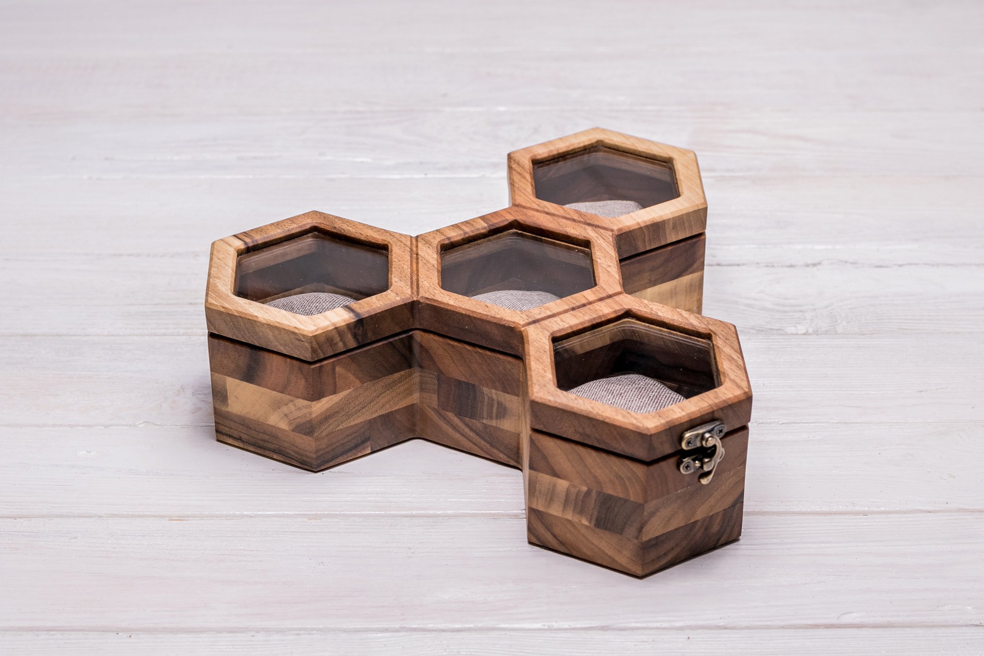 Представляємо Вашій увазі преміальні скриньки для зберігання на подушечках наручних годинників. Комбінація з бджолиних сот у залежності від кількості комірок робить виріб новим, унікальним і незвичайним органайзером . Деревина волоського горіха надає виробу преміального вигляду, якісна металева фурнітура грамотно підібрана під розмір і додає елегантності даним скринькам. Завдяки використанню ексклюзивної деревини, металевих (а не пластикових) кріплень, скла (а не акрилу), дорогої тканини та натуральних олій цей виріб буде дуже цінним і коштовним подарунком для будь-якої людини, котрій важливий комфорт та порядок в особистому просторі.