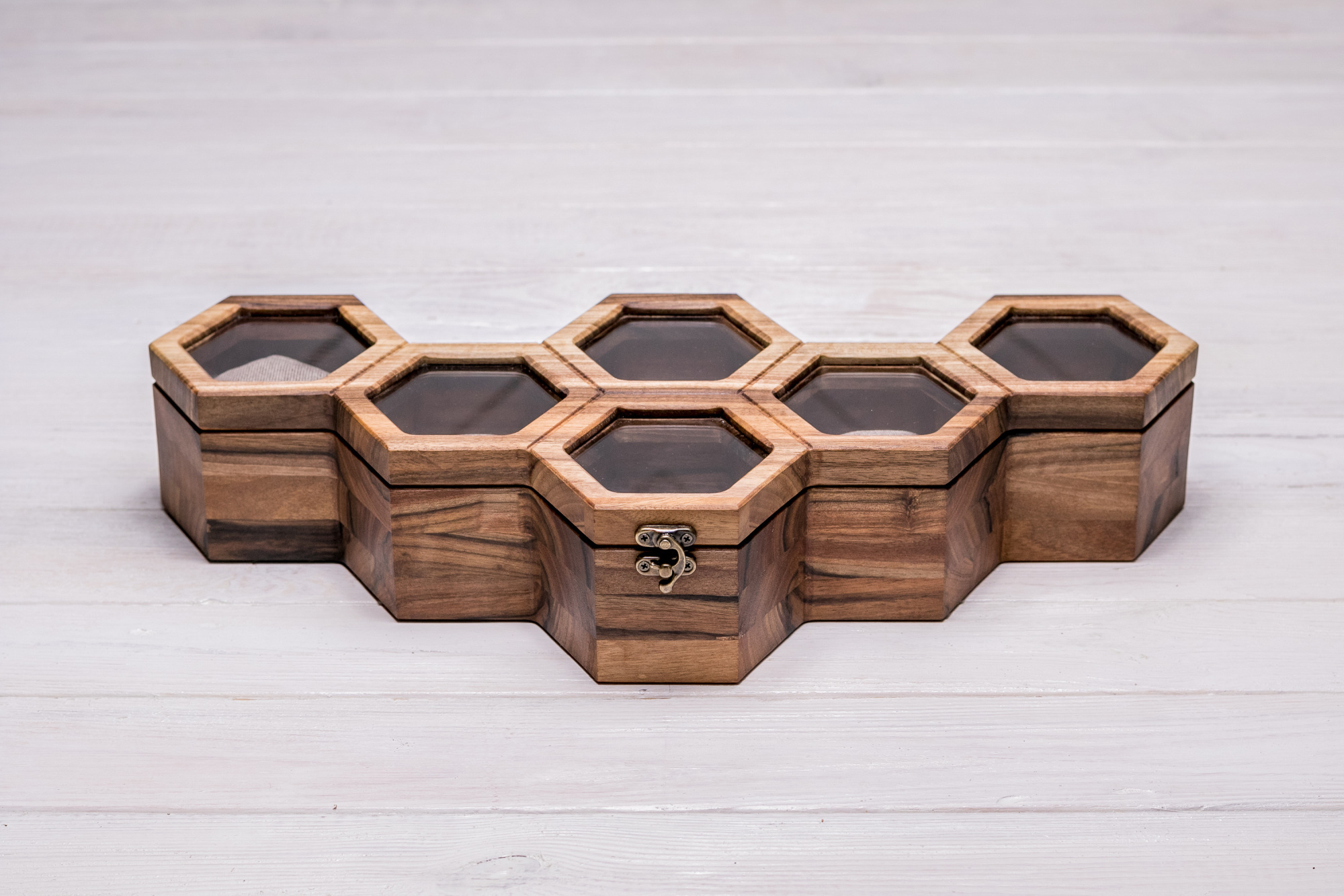 Представляємо Вашій увазі преміальні скриньки для зберігання на подушечках наручних годинників. Комбінація з бджолиних сот у залежності від кількості комірок робить виріб новим, унікальним і незвичайним органайзером . Деревина волоського горіха надає виробу преміального вигляду, якісна металева фурнітура грамотно підібрана під розмір і додає елегантності даним скринькам. Завдяки використанню ексклюзивної деревини, металевих (а не пластикових) кріплень, скла (а не акрилу), дорогої тканини та натуральних олій цей виріб буде дуже цінним і коштовним подарунком для будь-якої людини, котрій важливий комфорт та порядок в особистому просторі.