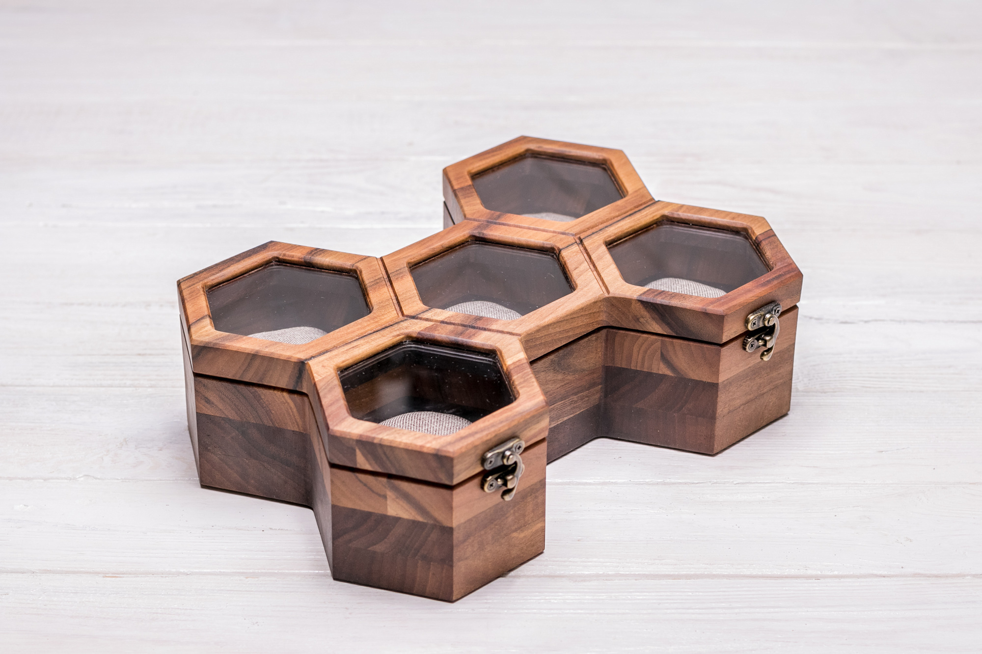 Представляємо Вашій увазі преміальні скриньки для зберігання на подушечках наручних годинників. Комбінація з бджолиних сот у залежності від кількості комірок робить виріб новим, унікальним і незвичайним органайзером . Деревина волоського горіха надає виробу преміального вигляду, якісна металева фурнітура грамотно підібрана під розмір і додає елегантності даним скринькам. Завдяки використанню ексклюзивної деревини, металевих (а не пластикових) кріплень, скла (а не акрилу), дорогої тканини та натуральних олій цей виріб буде дуже цінним і коштовним подарунком для будь-якої людини, котрій важливий комфорт та порядок в особистому просторі.