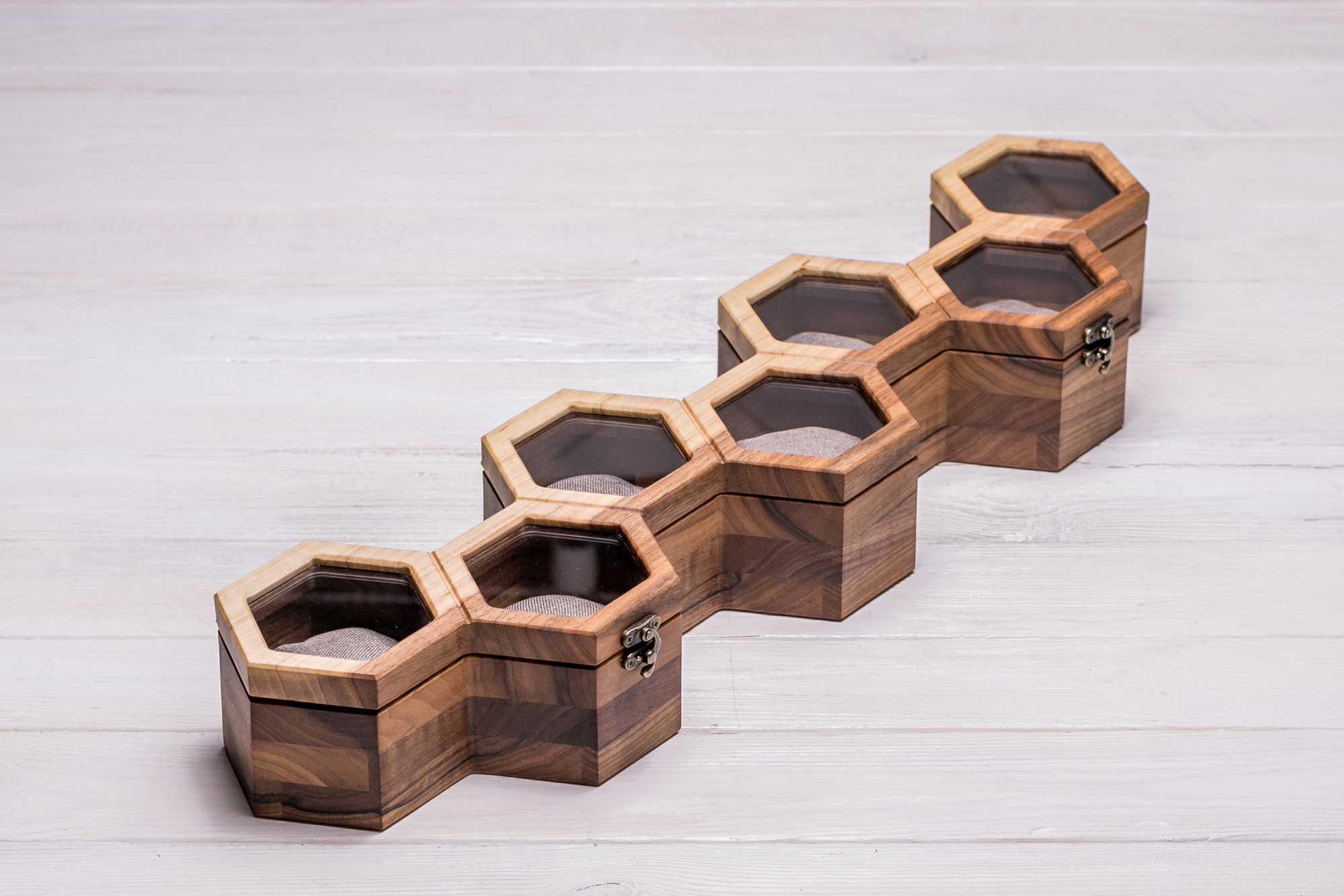 Представляємо Вашій увазі преміальні скриньки для зберігання на подушечках наручних годинників. Комбінація з бджолиних сот у залежності від кількості комірок робить виріб новим, унікальним і незвичайним органайзером . Деревина волоського горіха надає виробу преміального вигляду, якісна металева фурнітура грамотно підібрана під розмір і додає елегантності даним скринькам. Завдяки використанню ексклюзивної деревини, металевих (а не пластикових) кріплень, скла (а не акрилу), дорогої тканини та натуральних олій цей виріб буде дуже цінним і коштовним подарунком для будь-якої людини, котрій важливий комфорт та порядок в особистому просторі.