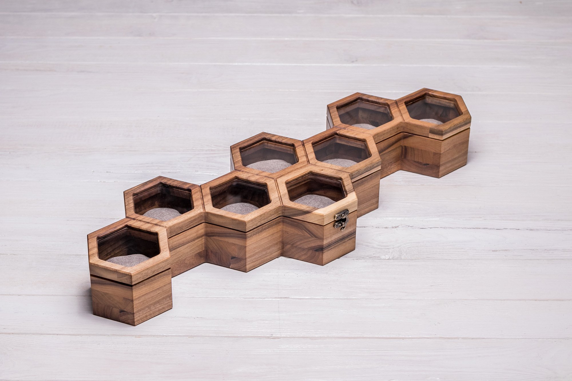Залежно від кількості комірок коробочки комплектуються подушечками для годинників із приємної на дотик тканини та якісних матеріалів, що робить виріб довговічним та зручним у використанні. На відміну від інших скриньок нашого виробництва, у сотових скриньках кришка фіксується вертикально, що також є унікальною особливістю цих виробів. Внутрішній розмір комірки: 80 мм між паралельними ребрами шестигранника, 68 мм – висота комірки. Цього більш ніж достатньо навіть для найбільших годинників, тому вони точно не торкатимуться кришки скриньки.