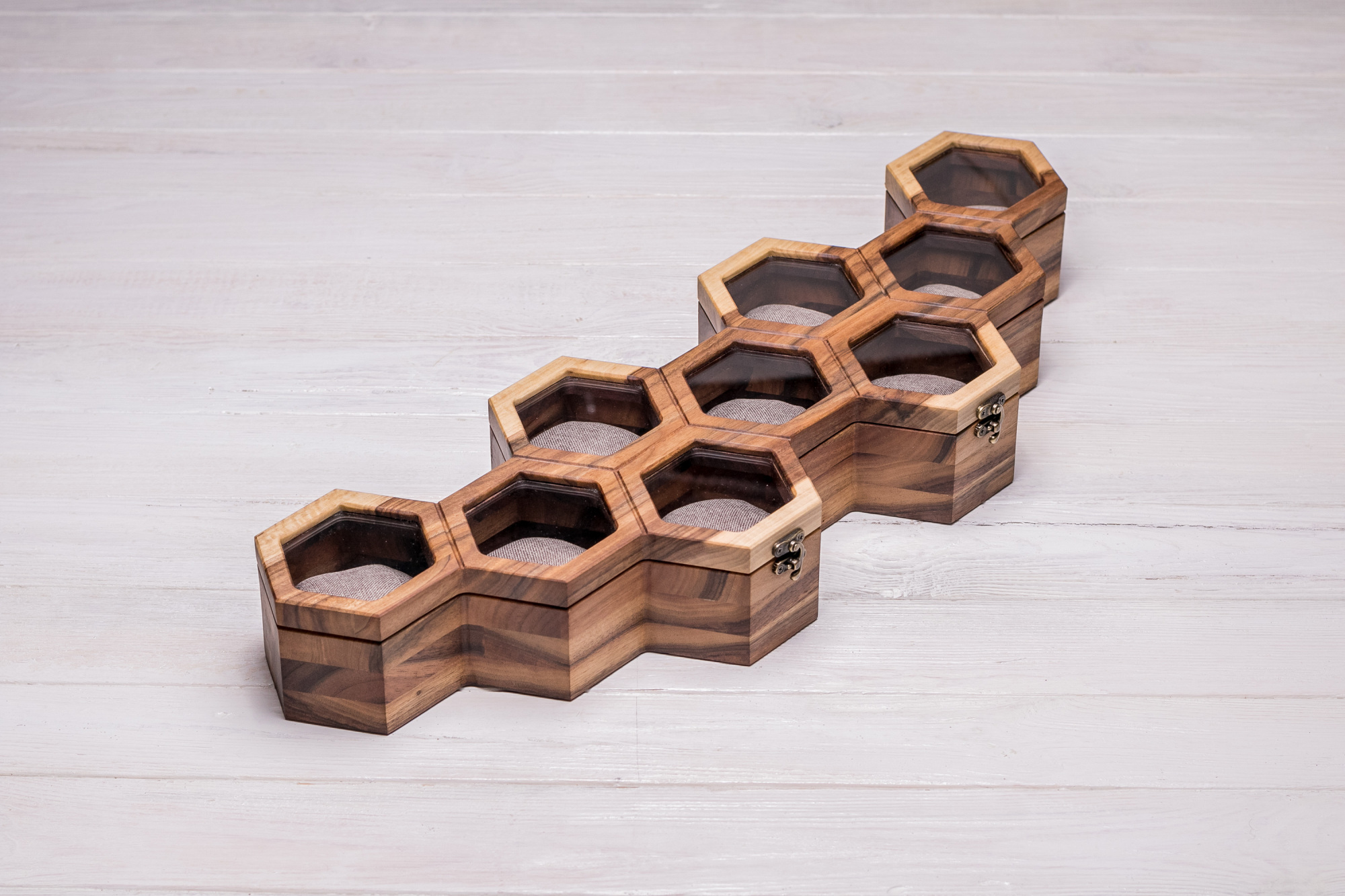 Залежно від кількості комірок коробочки комплектуються подушечками для годинників із приємної на дотик тканини та якісних матеріалів, що робить виріб довговічним та зручним у використанні. На відміну від інших скриньок нашого виробництва, у сотових скриньках кришка фіксується вертикально, що також є унікальною особливістю цих виробів. Внутрішній розмір комірки: 80 мм між паралельними ребрами шестигранника, 68 мм – висота комірки. Цього більш ніж достатньо навіть для найбільших годинників, тому вони точно не торкатимуться кришки скриньки.