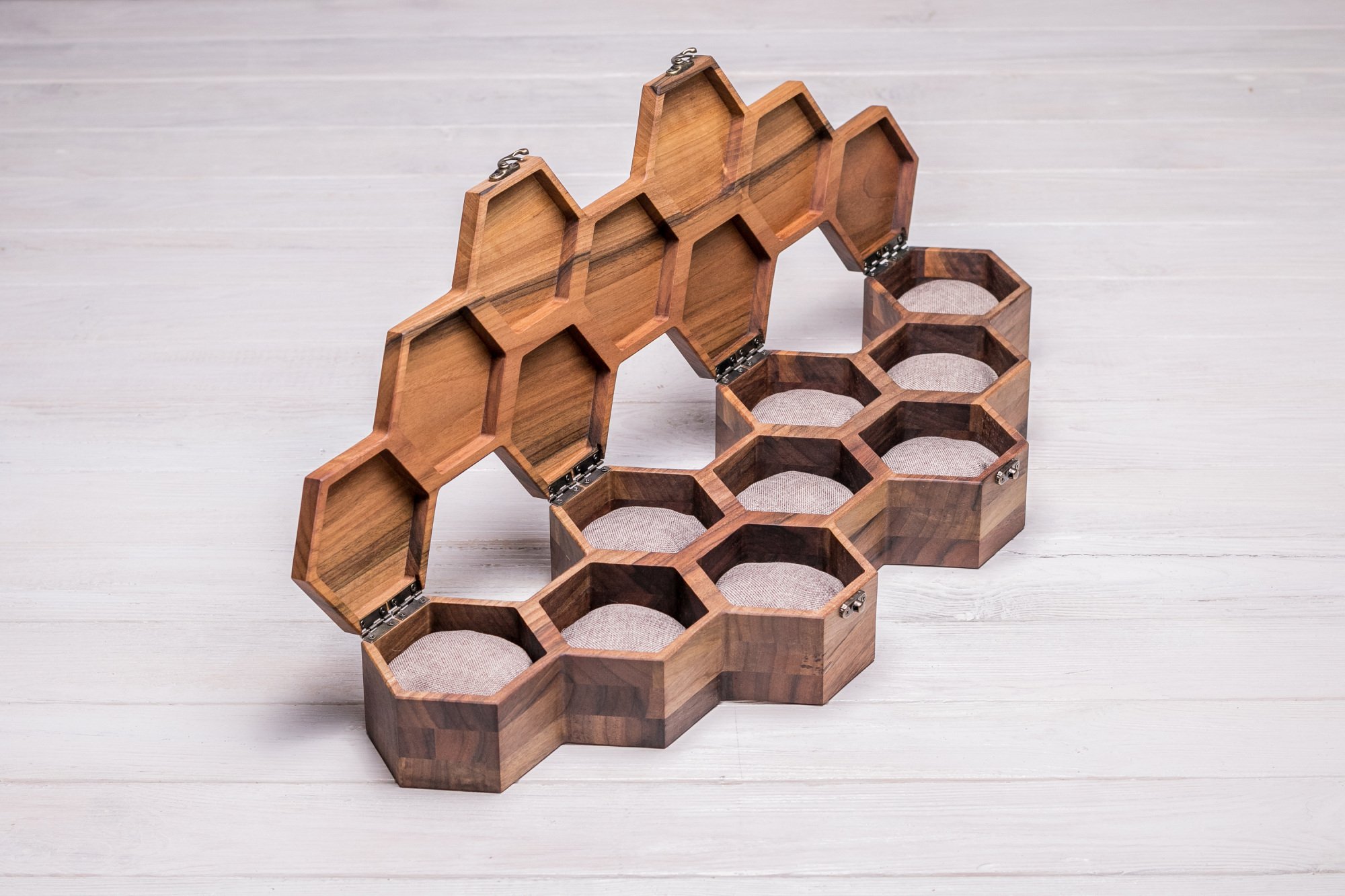 Залежно від кількості комірок коробочки комплектуються подушечками для годинників із приємної на дотик тканини та якісних матеріалів, що робить виріб довговічним та зручним у використанні. На відміну від інших скриньок нашого виробництва, у сотових скриньках кришка фіксується вертикально, що також є унікальною особливістю цих виробів. Внутрішній розмір комірки: 80 мм між паралельними ребрами шестигранника, 68 мм – висота комірки. Цього більш ніж достатньо навіть для найбільших годинників, тому вони точно не торкатимуться кришки скриньки.