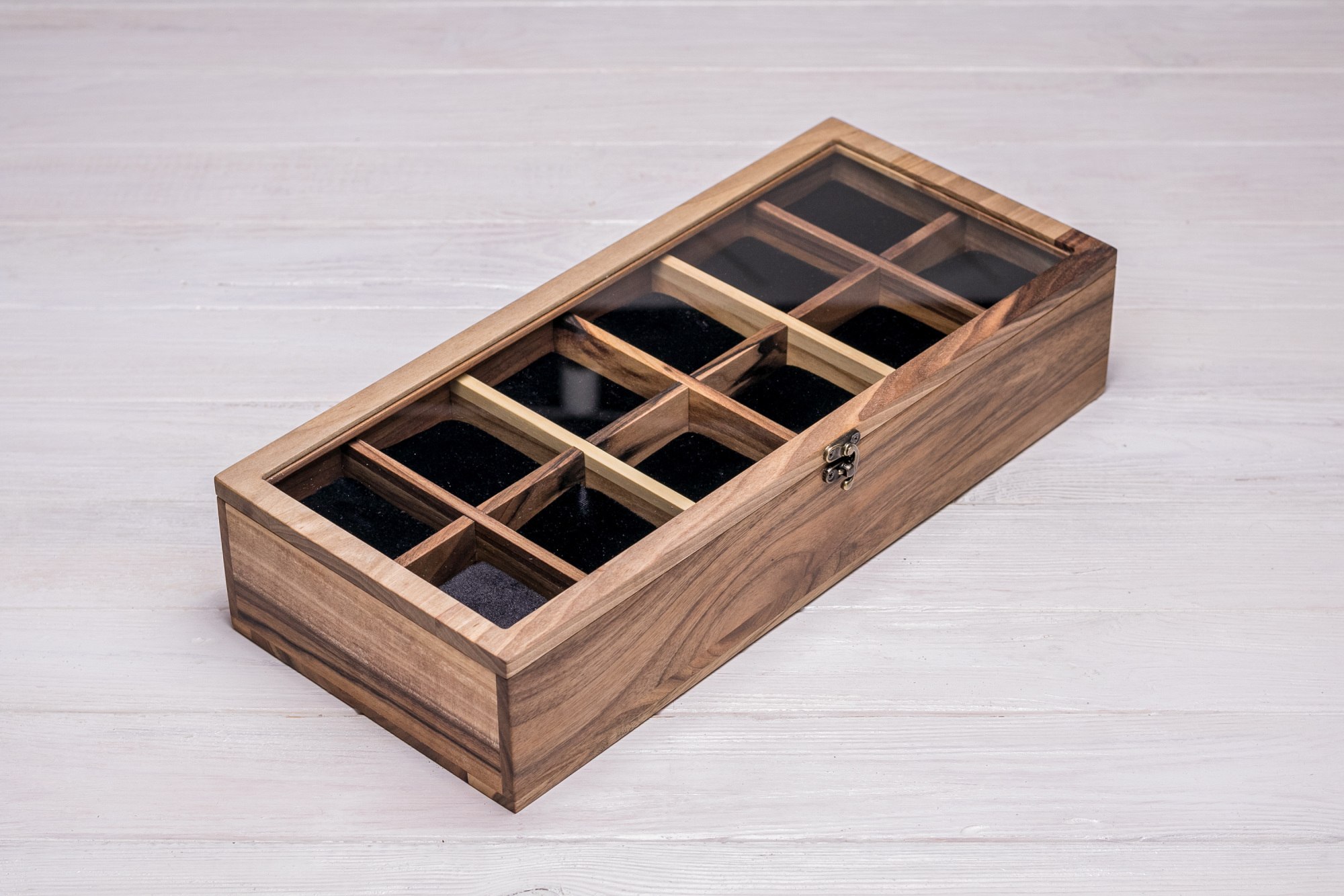 Представляємо Вам серію коробочок-органайзерів для годинників на ремінцях. Високоякісне виробництво майстрів столярної справи, застосування тільки натуральних матеріалів - деревини, скла та олій, і якісна металева фурнітура роблять наш органайзер для годинників цінним і вартим подарунком для будь-якої людини, кому важливий комфорт та порядок в особистому просторі. У комплекті йде відповідна кількість подушечок із дуже м'якої тканини чорного, синього, червоного або зеленого (на вибір) кольорів, тому процес укладання годинників назад в органайзер вкрай приємний. Розмір комірки - 60х80х65 мм, чого більш ніж достатньо навіть для громіздких годинників.