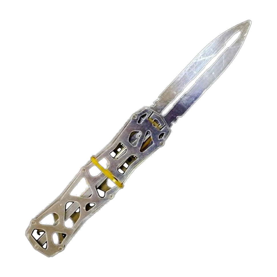Ніж дерев'яний "ВИКИДУХА" СКЕЛЕТОН (CHROM) Матеріал: Березова фанера RC:R[3]Cрізних відтінків, виконана з фанери, ламінована золотою фольгою. Довжина ножа-23 см, ширина ручки-3 см. Чудовий подарунок для дитини чи фаната холодної зброї. Ніж дерев'яний, якісний та міцний. Служить довго. НЕ заточений, гострі частини закруглені та зашліфовані, повністю безпечний для дітей.
