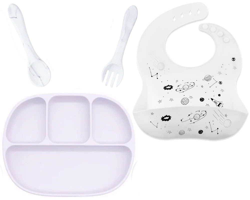 Набір силіконовий посуд 2Life D1 прилади Y1 та слинявчик космос Білий (v-11781)