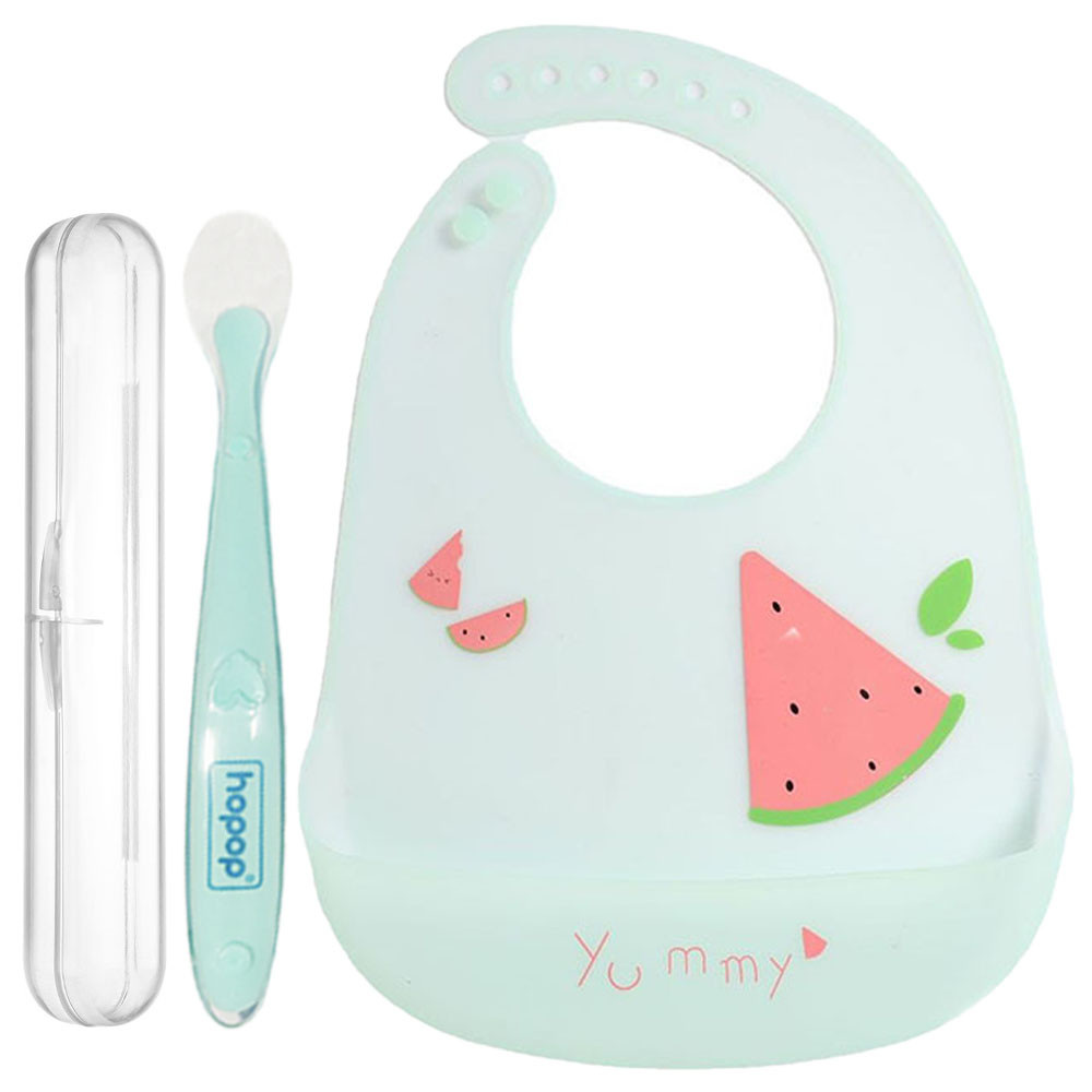 Характеристики товару Силіконова ложка в кейсі 2Life та слинявчик Зелений (v-11916)
