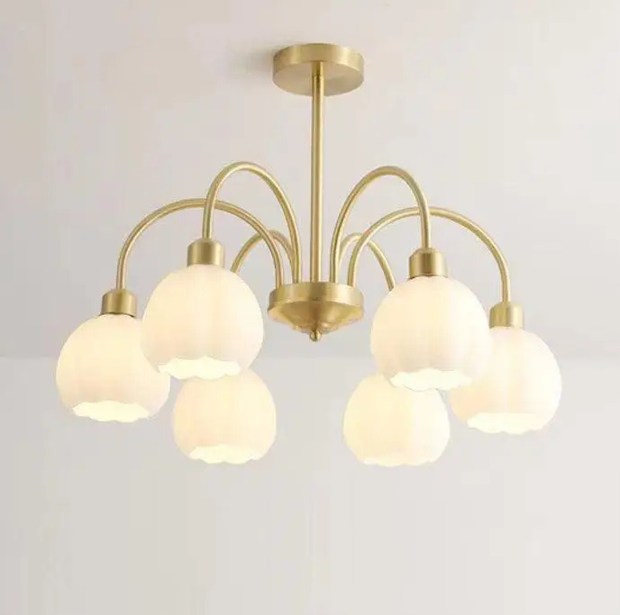 Світлодіодна люстра Тюльпан 5000 складається з центральної металевої основи золотистого кольору, від якої радіально відходять плавні вигнуті руки. На кінцях кожної руки розташовані світильники з матових скляних абажурів м'якого білого кольору з затишним відтінком. Абажури мають форму, що нагадує цибулини або тюльпана, що надають дизайну нотки вінтажу та класики.