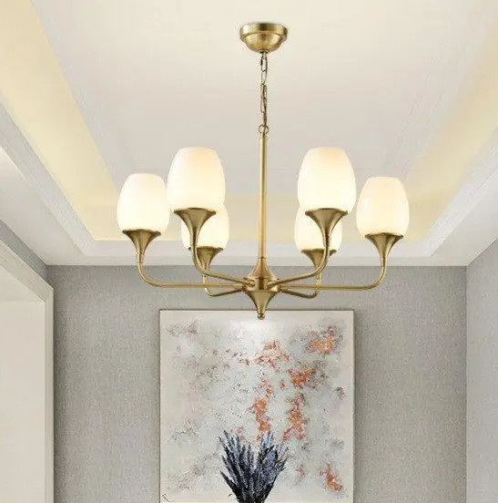 Абажури, виготовлені з матового скла, забезпечують затишне розсіяне світло, ідеальне для створення релаксуючої атмосфери в житловому просторі. Ця люстра може стати гарним доповненням як класичного інтер'єру з багатими орнаментами, так і більш мінімалістичного і сучасного дизайну, надаючи йому елемент традиційної розкоші.