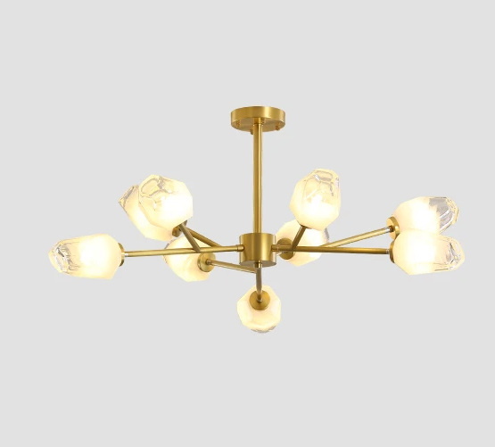 Сучасна люстра із золотавим металевим каркасом та багато білих, матових скляних абажурів. Абажури розташовані на кінцях елегантно зігнутих рук, що виходять від центральної частини світильника, створюючи враження легкості та візуальної гармонії. Люстра має багатогранну конфігурацію, що дозволяє поступово розподілити світло по приміщенню. Такий дизайн ідеально підійде для сучасного житлового простору або комерційного інтер'єру, де шукає сучасний, але водночас теплий та затишний вигляд.