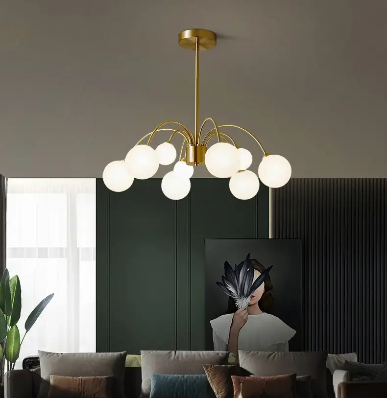 • Дизайн: Елегантна конструкція з біло-матовими кулями та золотистою обробкою конструкції, створює розкішний та сучасний вигляд, який одразу привертає увагу.
